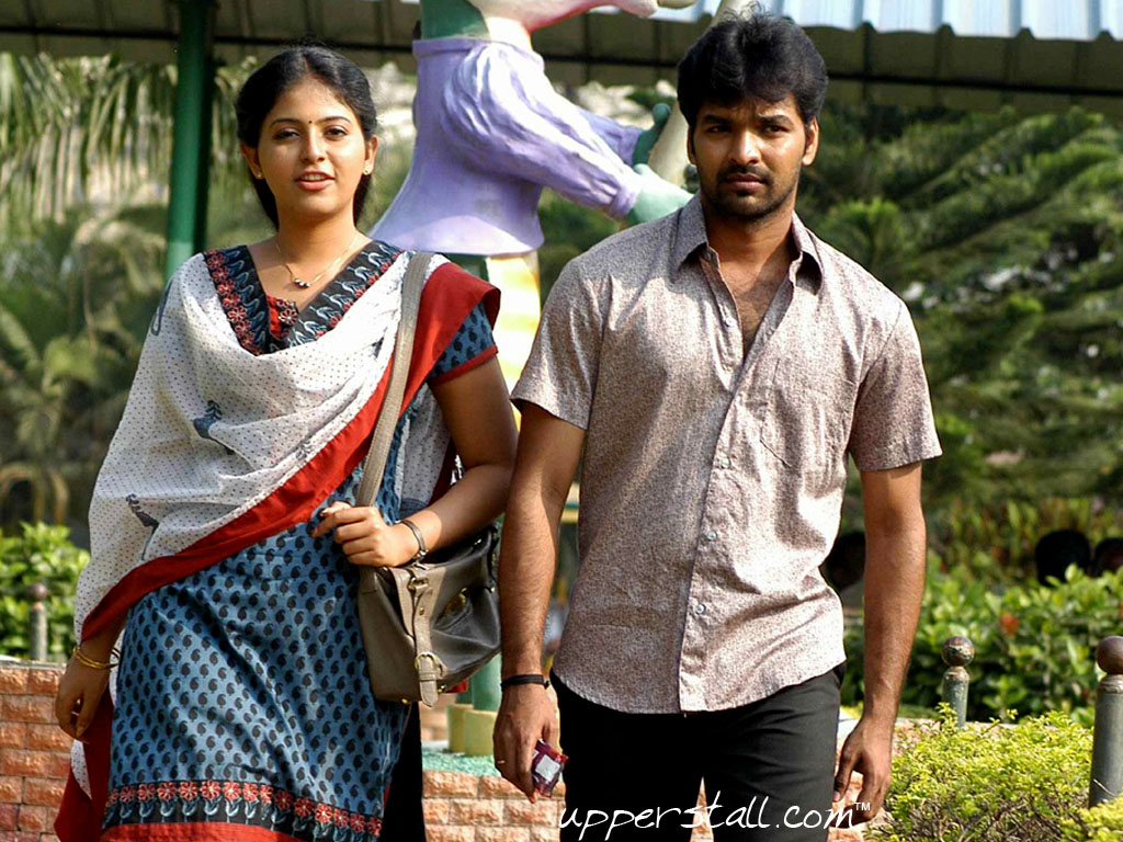 Description: A man and woman walking in front of a statue of a woman and a man in a dress shirt.