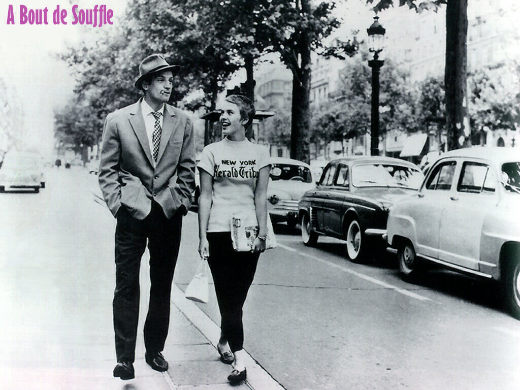 Description: A man and a woman walking down a street next to a car and a tree in the background with a pink and white sign.