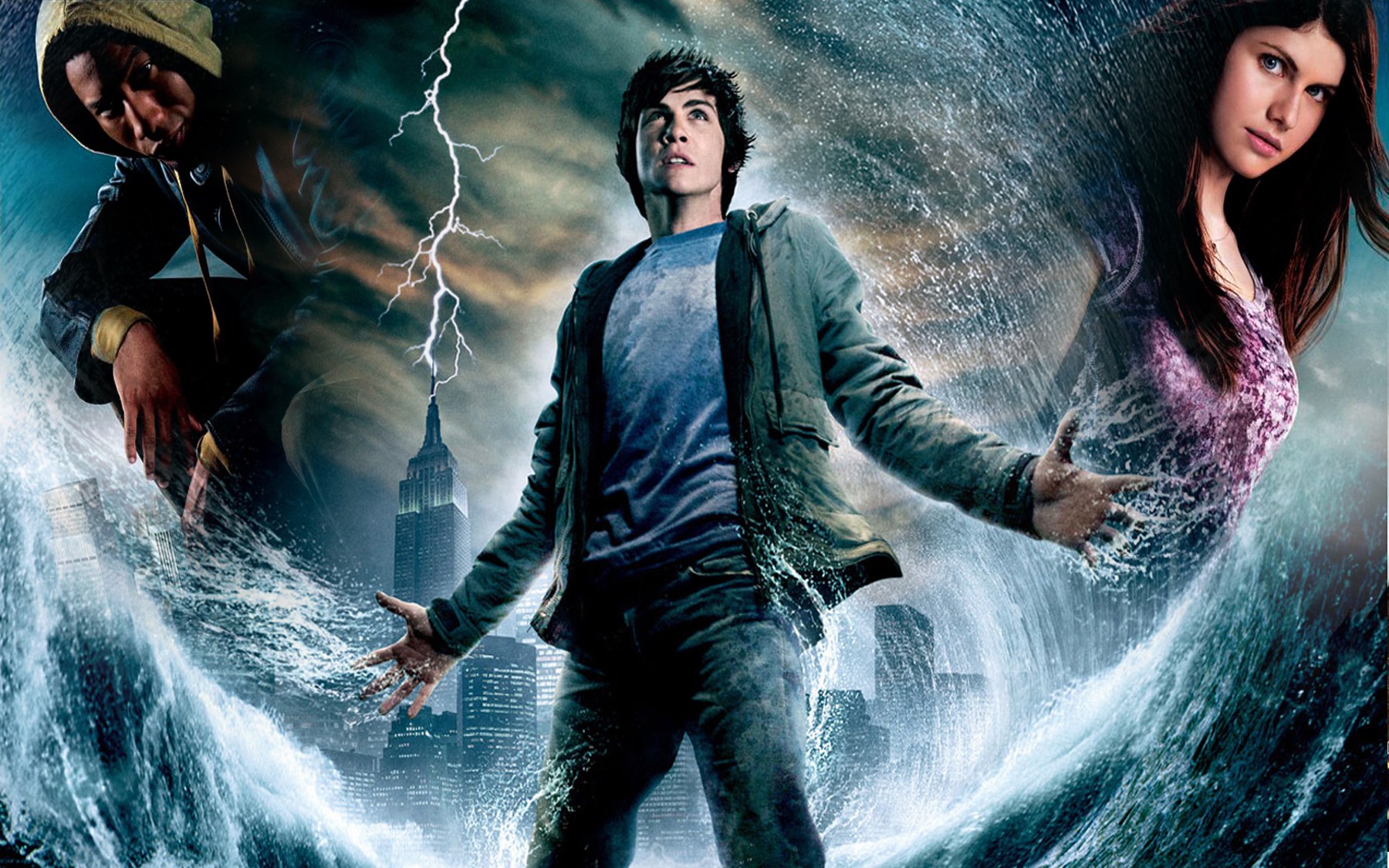 Description: A man and a woman standing in a wave of water with a city in the background and lightning in the sky.