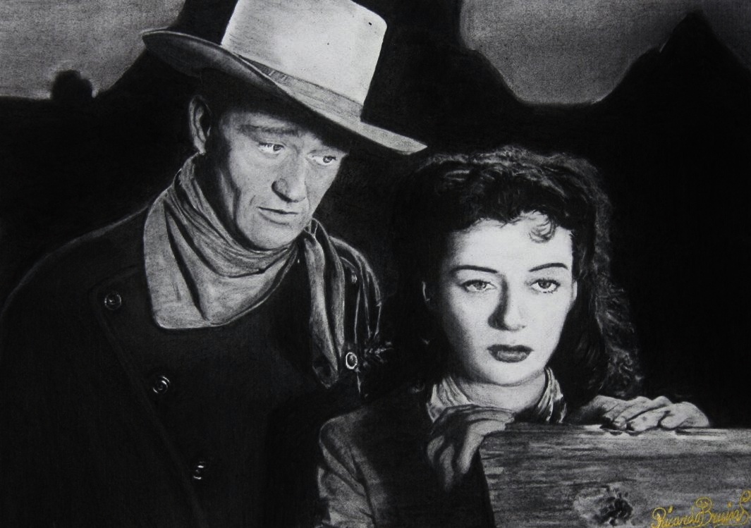 Description: A drawing of a man and a woman looking over a wooden box with a hat on top of it.