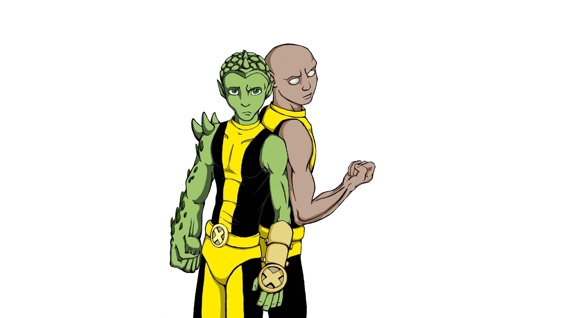 Description: A man and a woman in yellow and black costumes with alligators on their arms and legs.