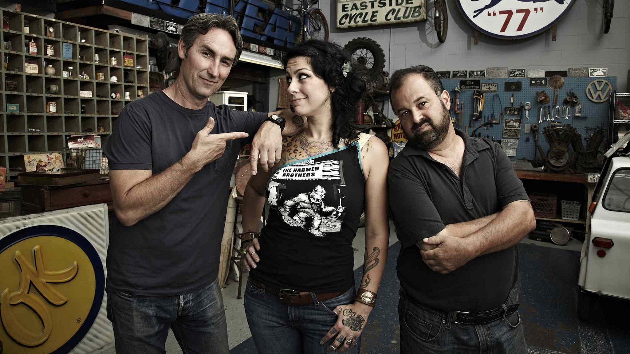 Description: A man and two women standing in a garage with a car in the background and a wall of shelves with various tools.