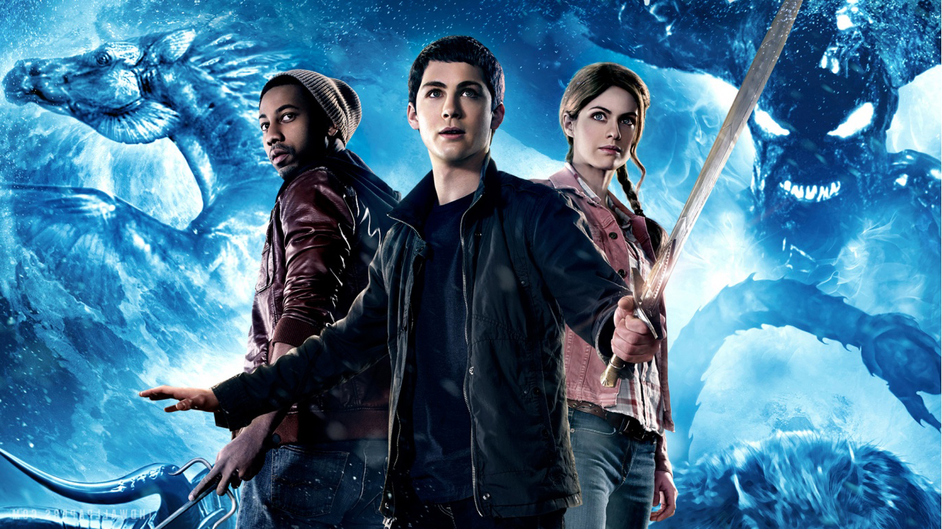Description: A man and two women standing in front of a poster of a monster with two swords in their hands.