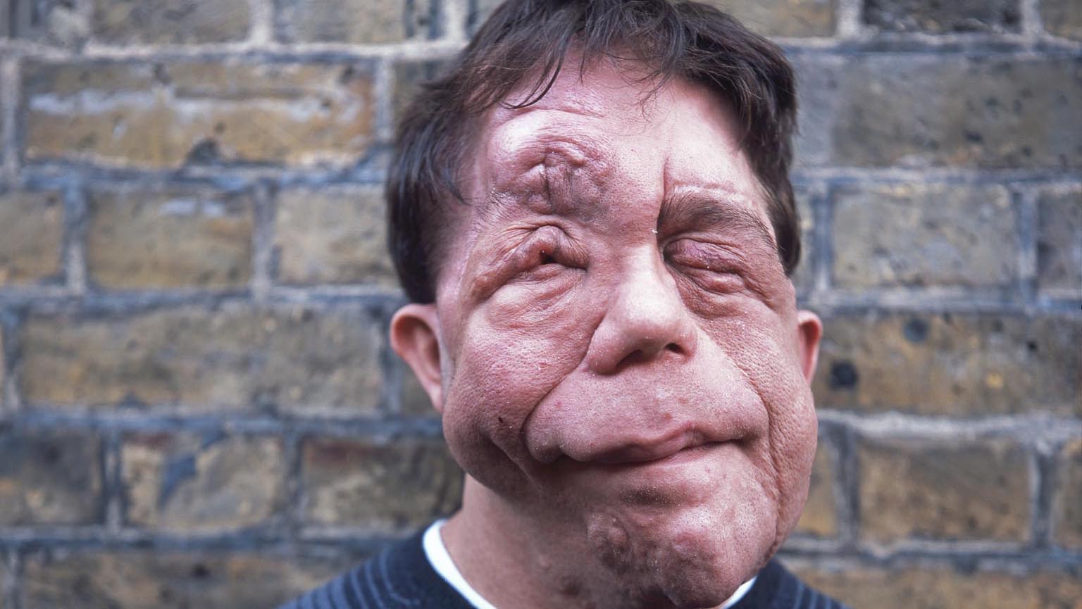 Description: A man with wrinkles on his face and neck standing in front of a brick wall with a brick wall behind him.