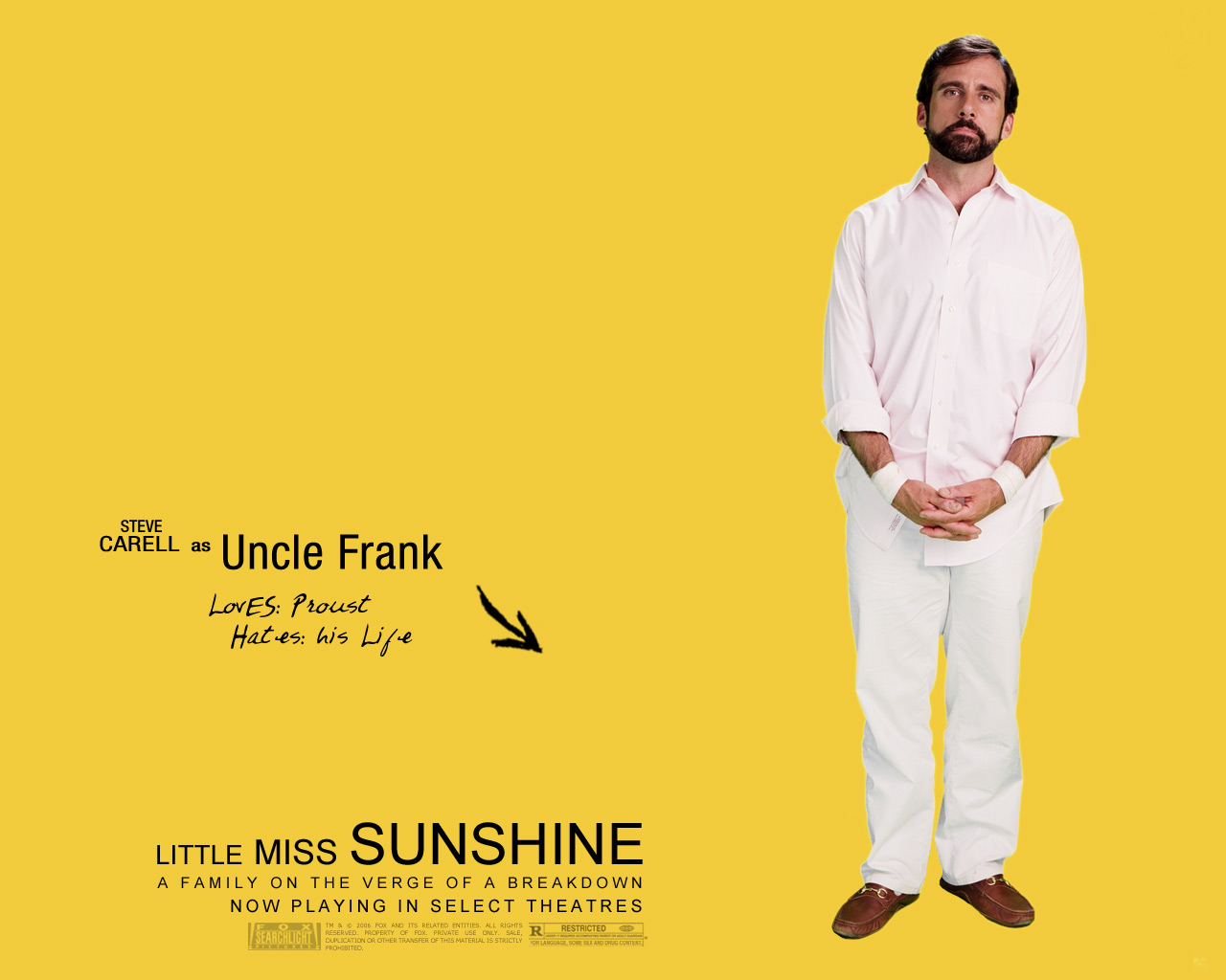 Description: A man standing in front of a yellow background with the words uncle frank and little miss sunshine written below.