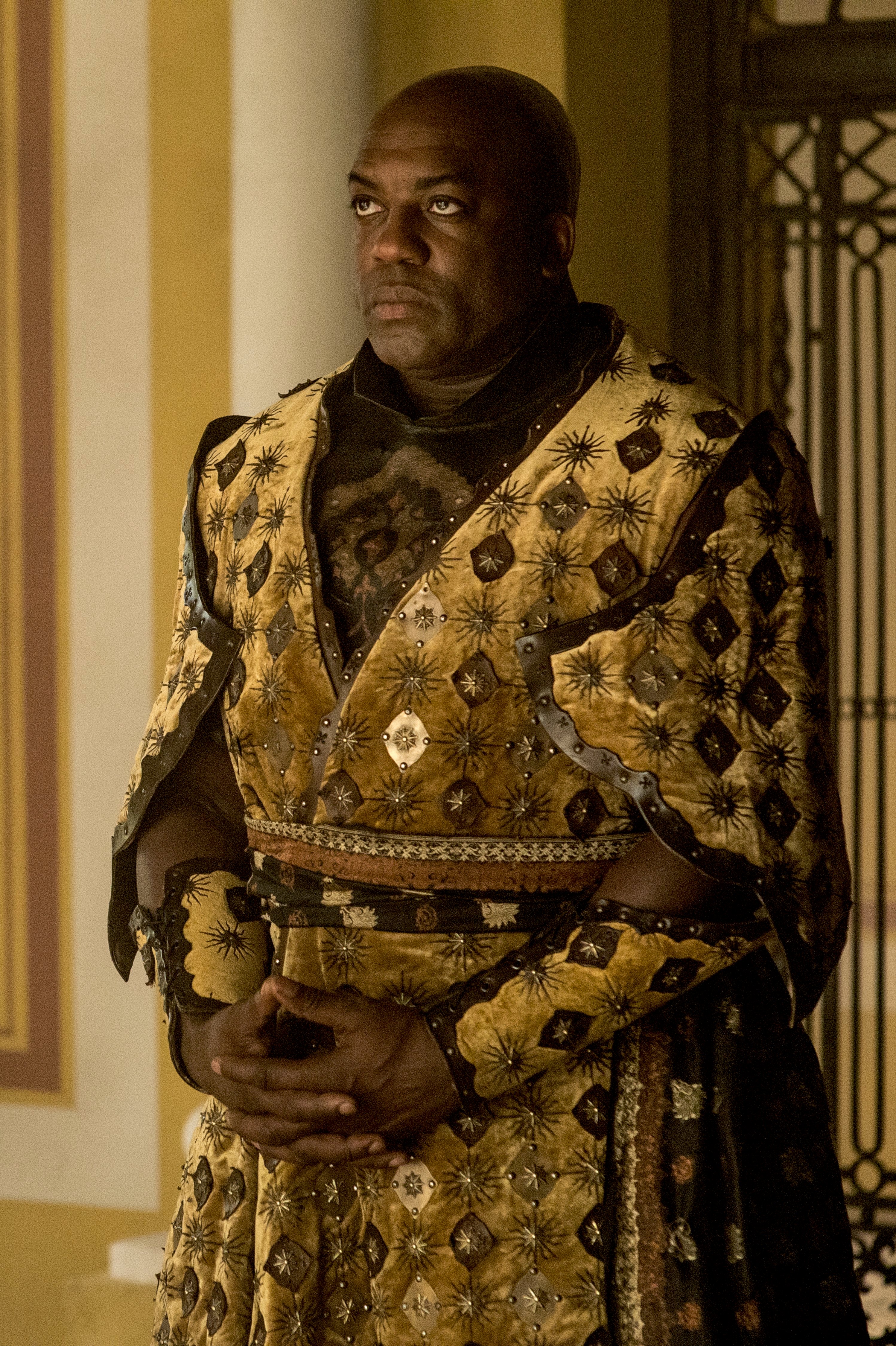 Description: A man in a yellow and black outfit standing in front of a building with a gate and a door.