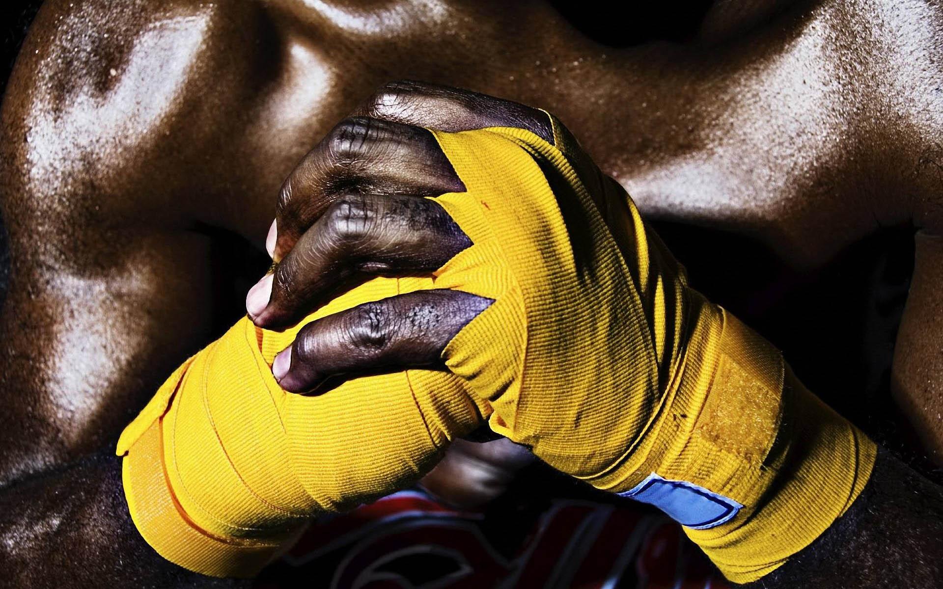 Description: A man with a yellow glove on his arm and a red and white striped shirt on his chest and arm.