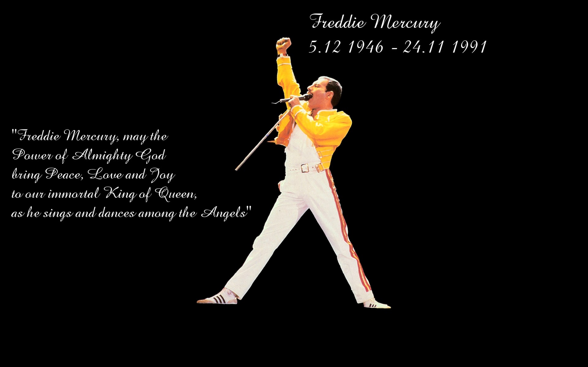 Description: A man in a yellow jacket holding a microphone and a black background with a quote from the beatles on it.