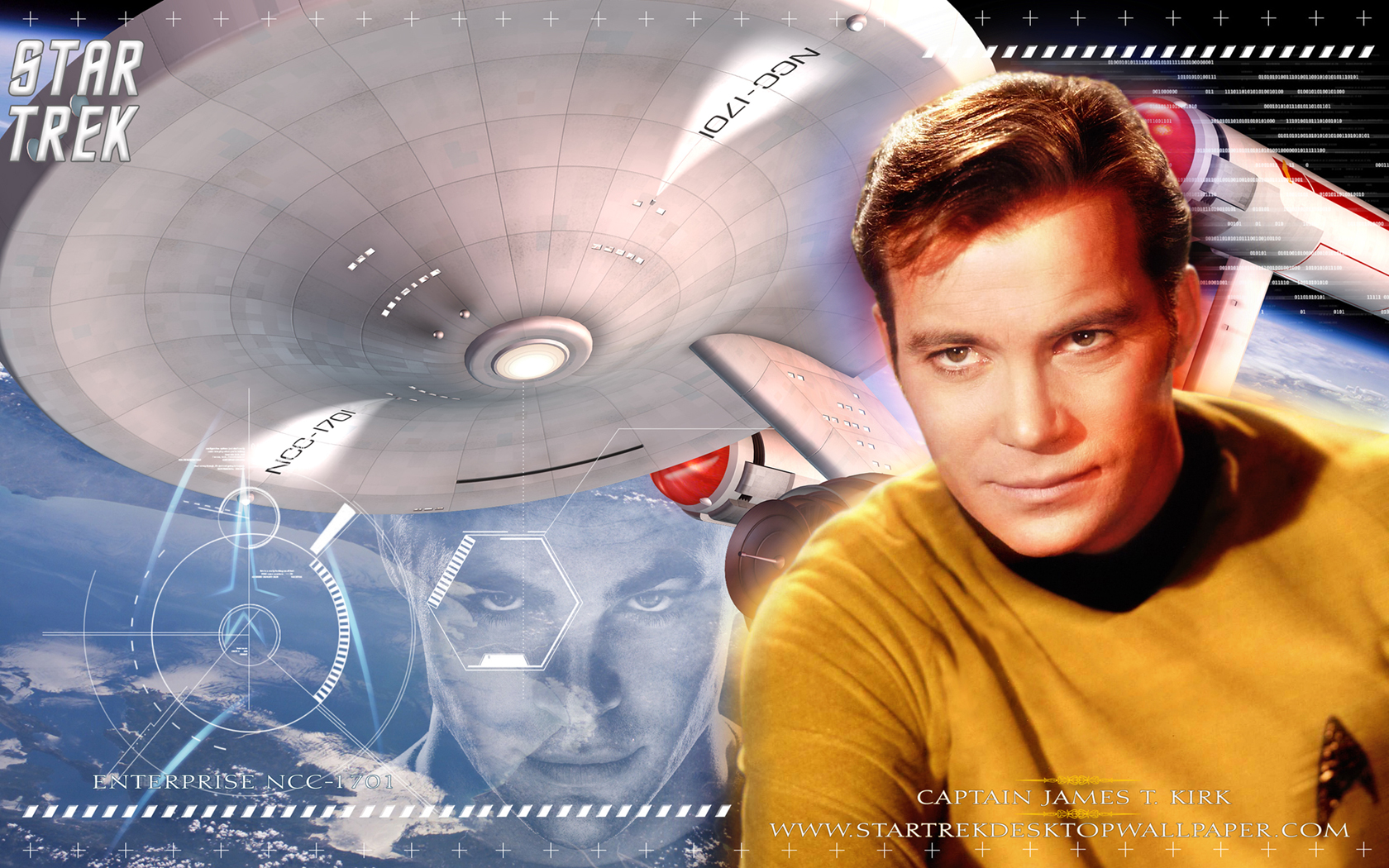 Description: A man in a yellow shirt is in front of a picture of a star trek ship and a space station.