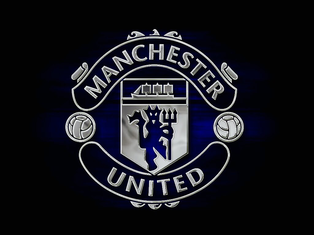 Description: A manchester united logo on a black background with a blue light behind it and a soccer ball in the center.