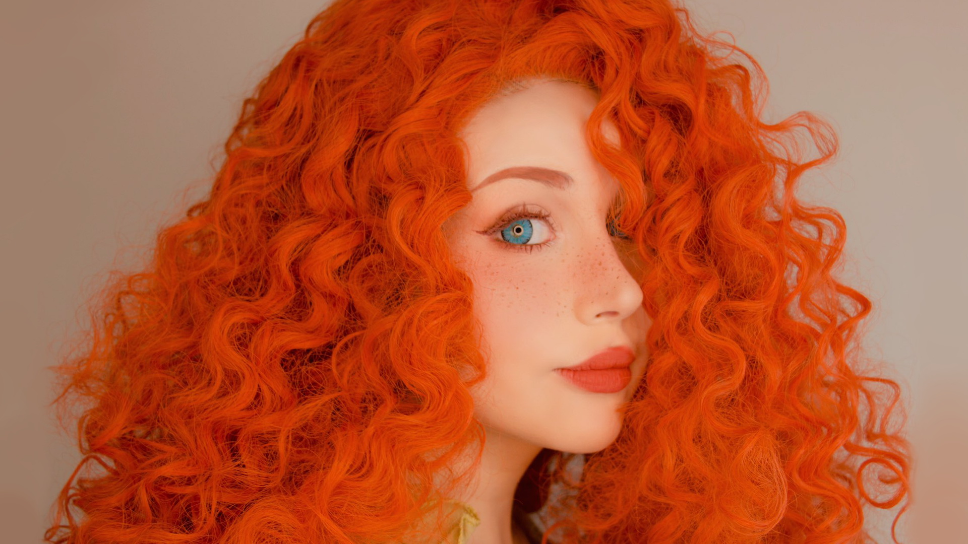 Description: A close up of a mannequin head with red hair and blue eyes and a green shirt on.