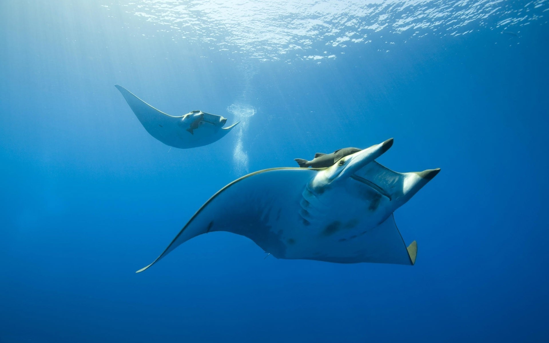 Description: A manta ray swimming in the ocean with a manta ray swimming nearby in the water.