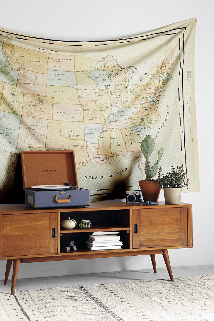 Description: A map of the united states hangs on a wall behind a wooden cabinet with a suitcase and a suitcase on it.