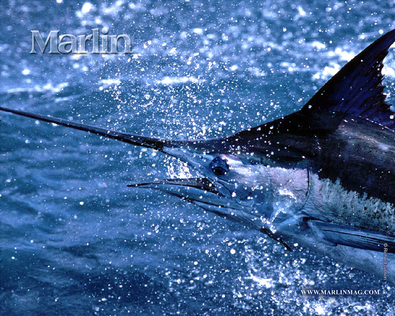 Description: A marlin is caught in the water with a fishing rod in its mouth and a fishing hook in its mouth.