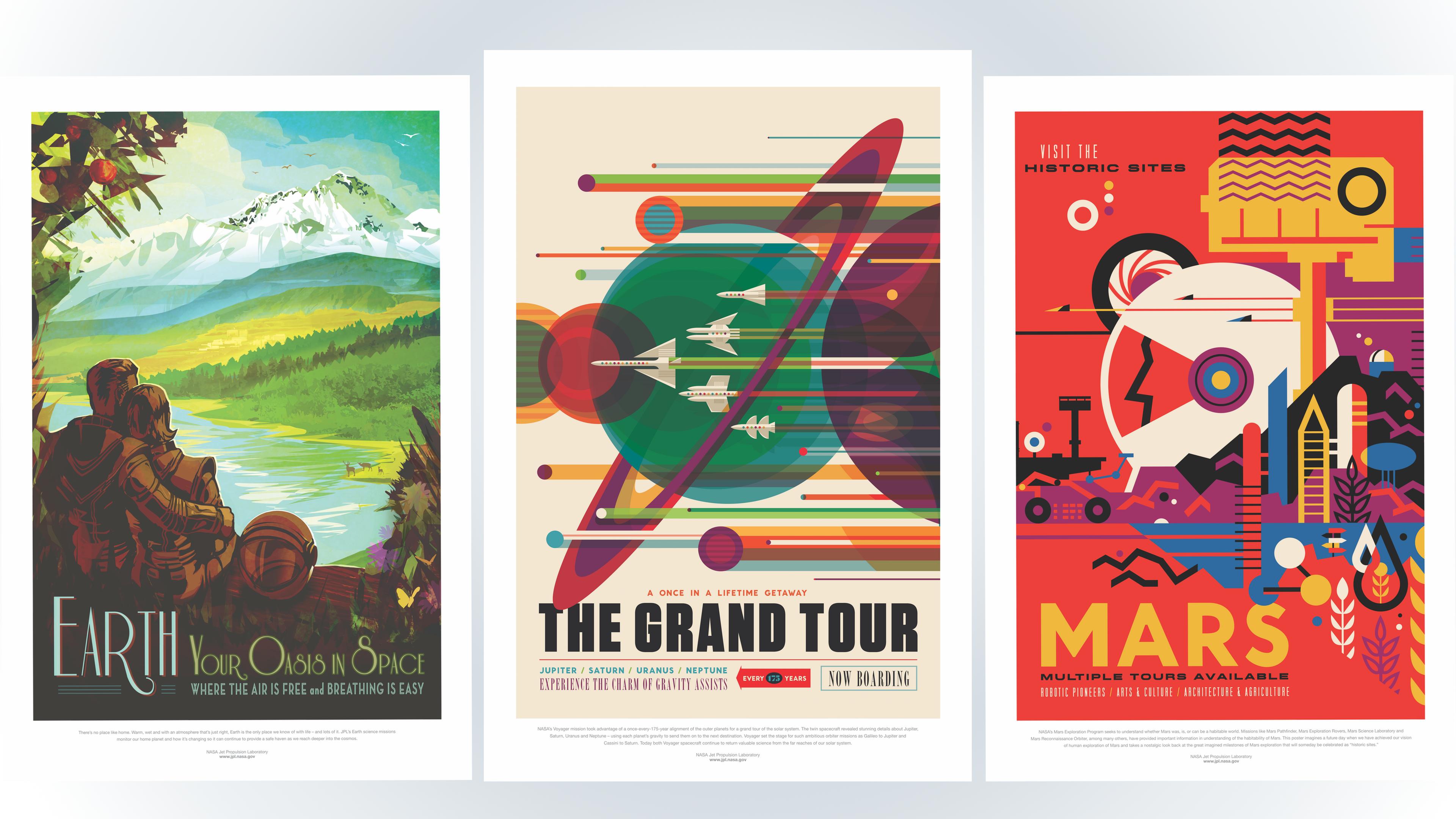 Description: Three posters of the grand tour of mars and the earth from the same time of day and night.