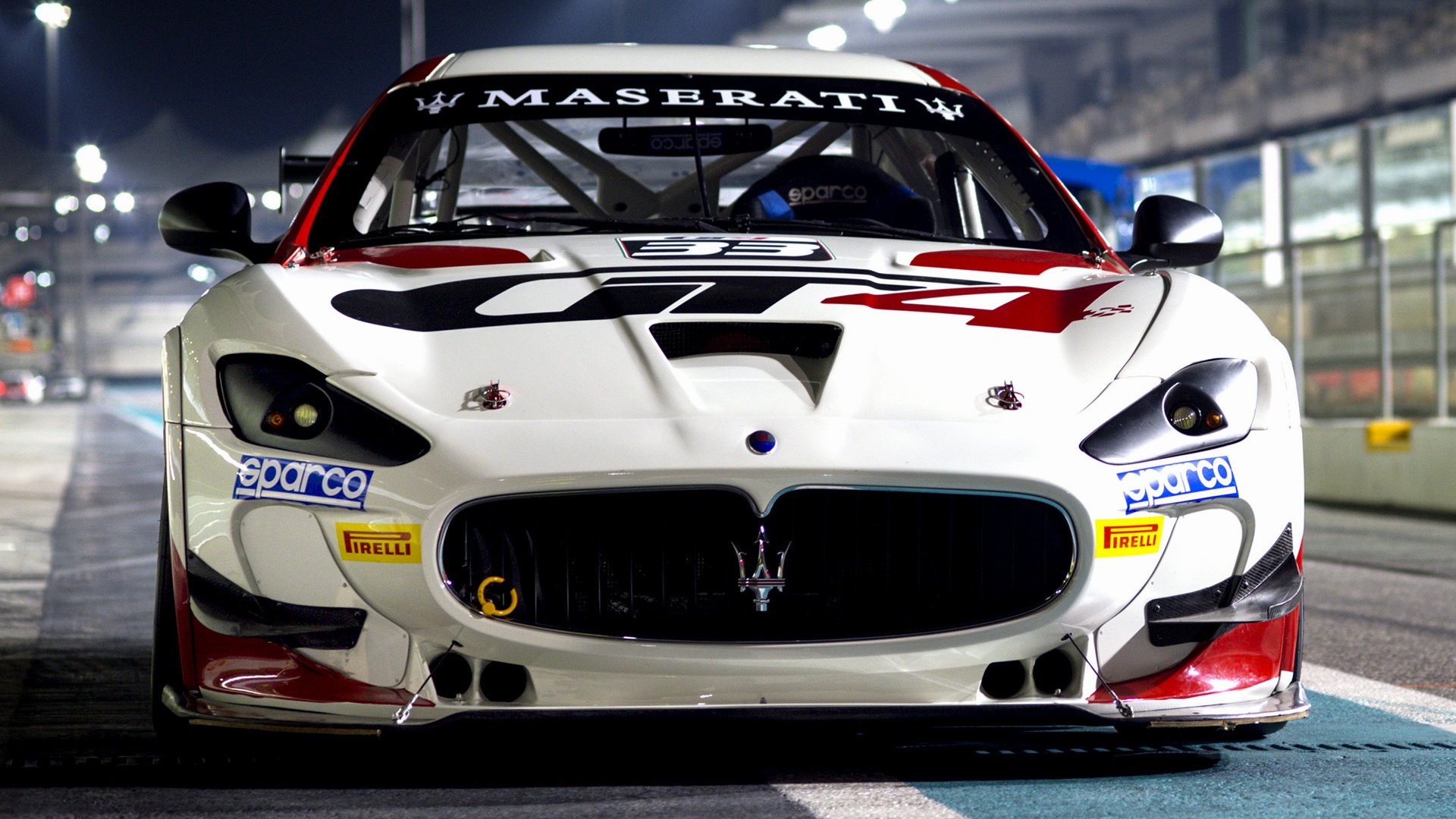 Description: A maserati racing car driving down a race track at night time with lights on the side of the car.