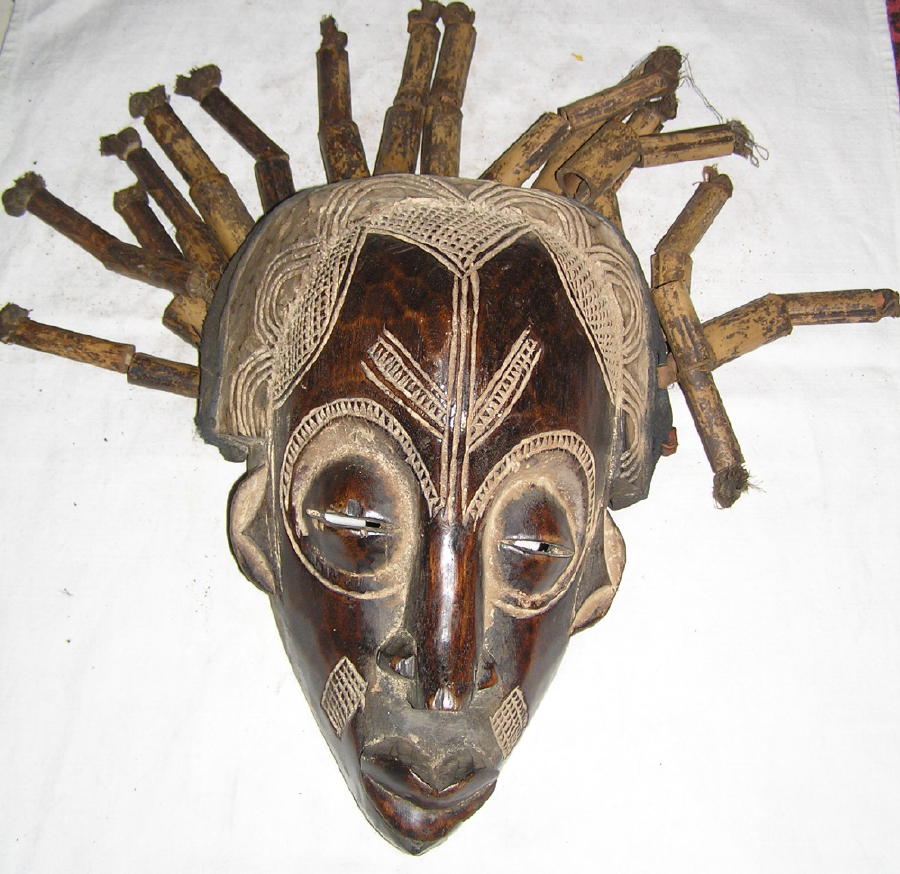 Description: A mask with sticks sticking out of it's face on a white cloth covered tablecloth with a red and white table cloth.