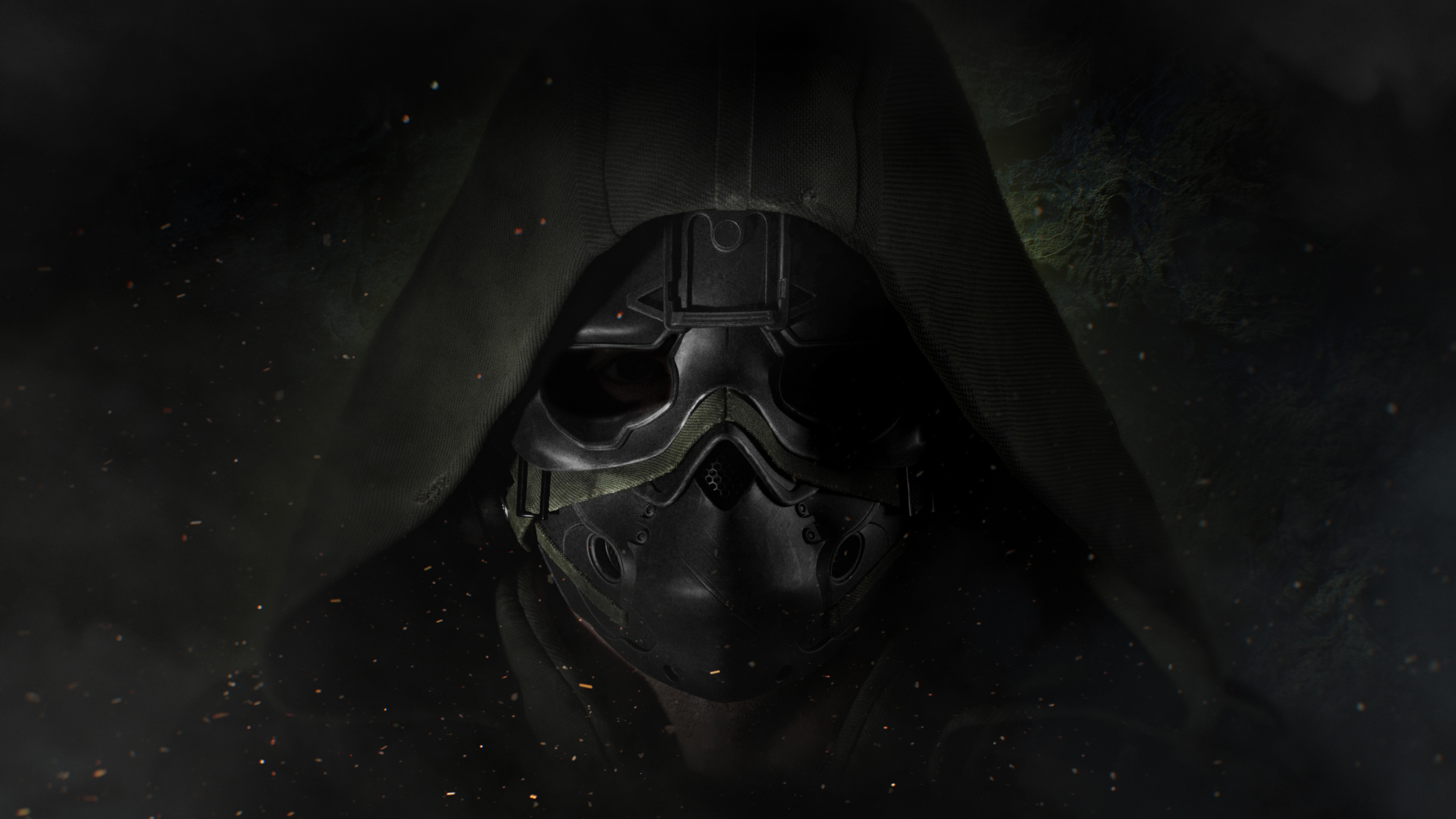 Description: A man in a black mask with a hood on and a black background with stars around him and a black smoke cloud.