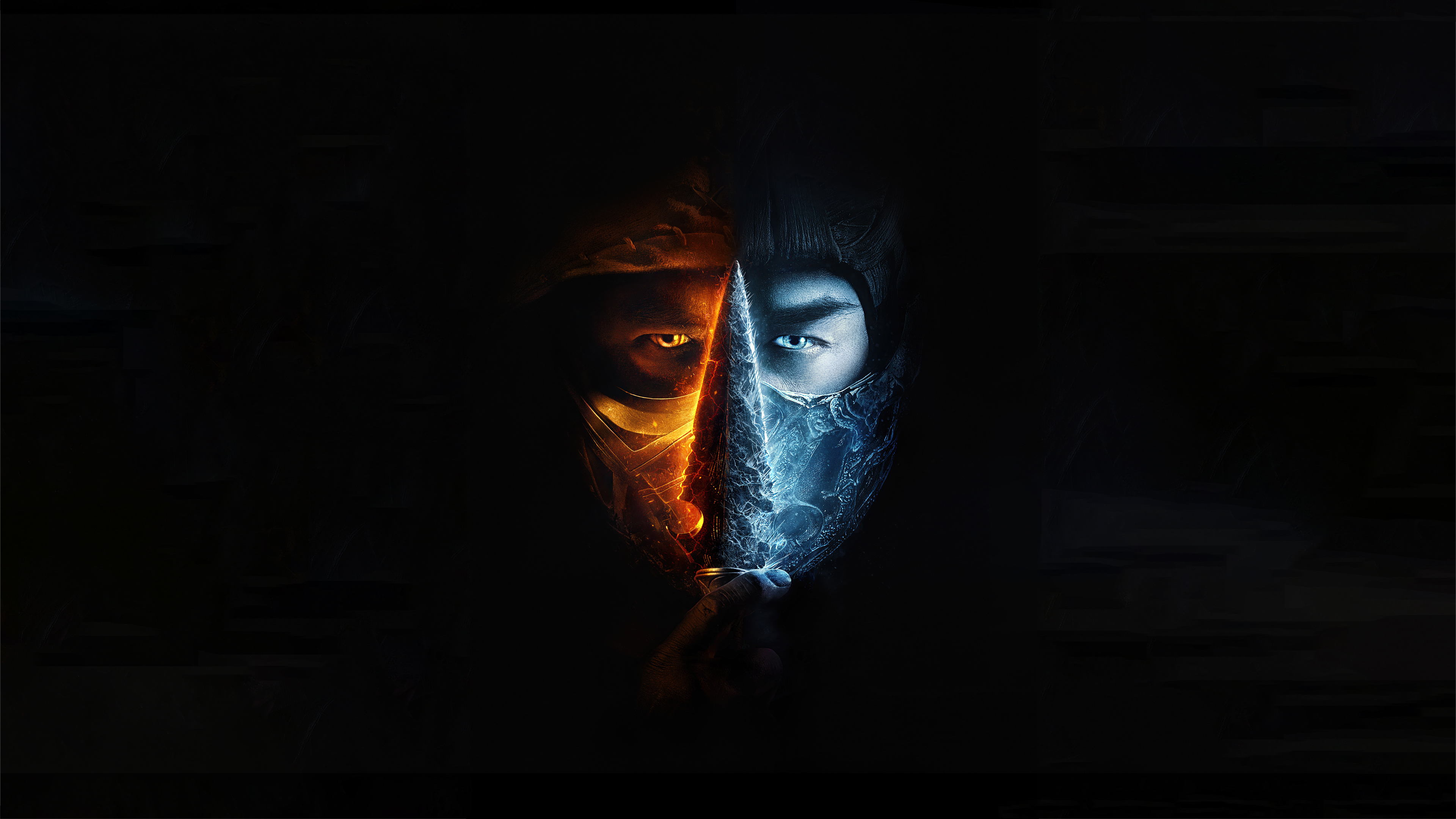 Description: A person with a mask on and a light behind them in the dark with a fire behind them and a person with a knife in the dark.