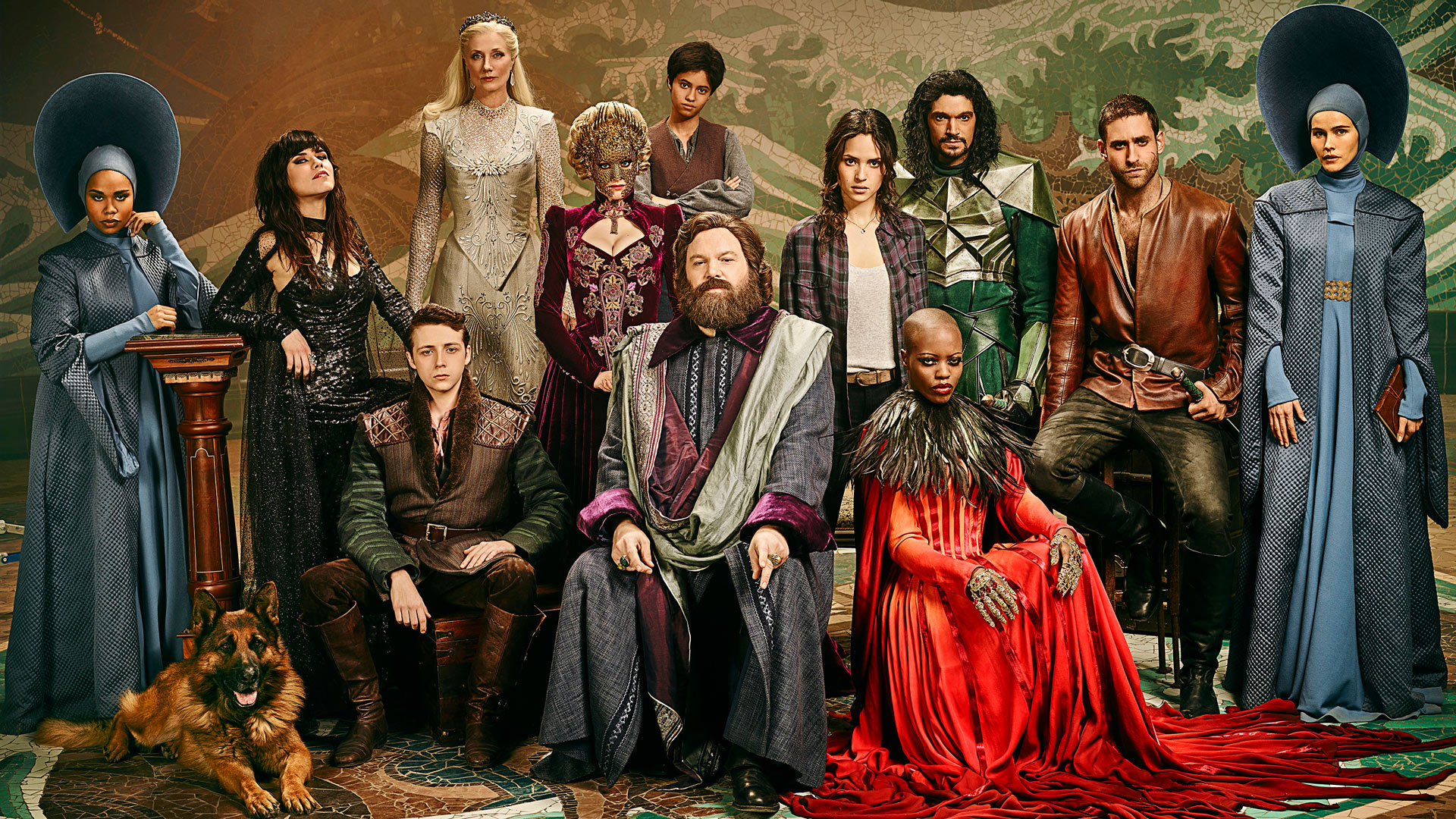 Description: A group of people dressed in medieval costumes and with a dog sitting on a chair in front of them.
