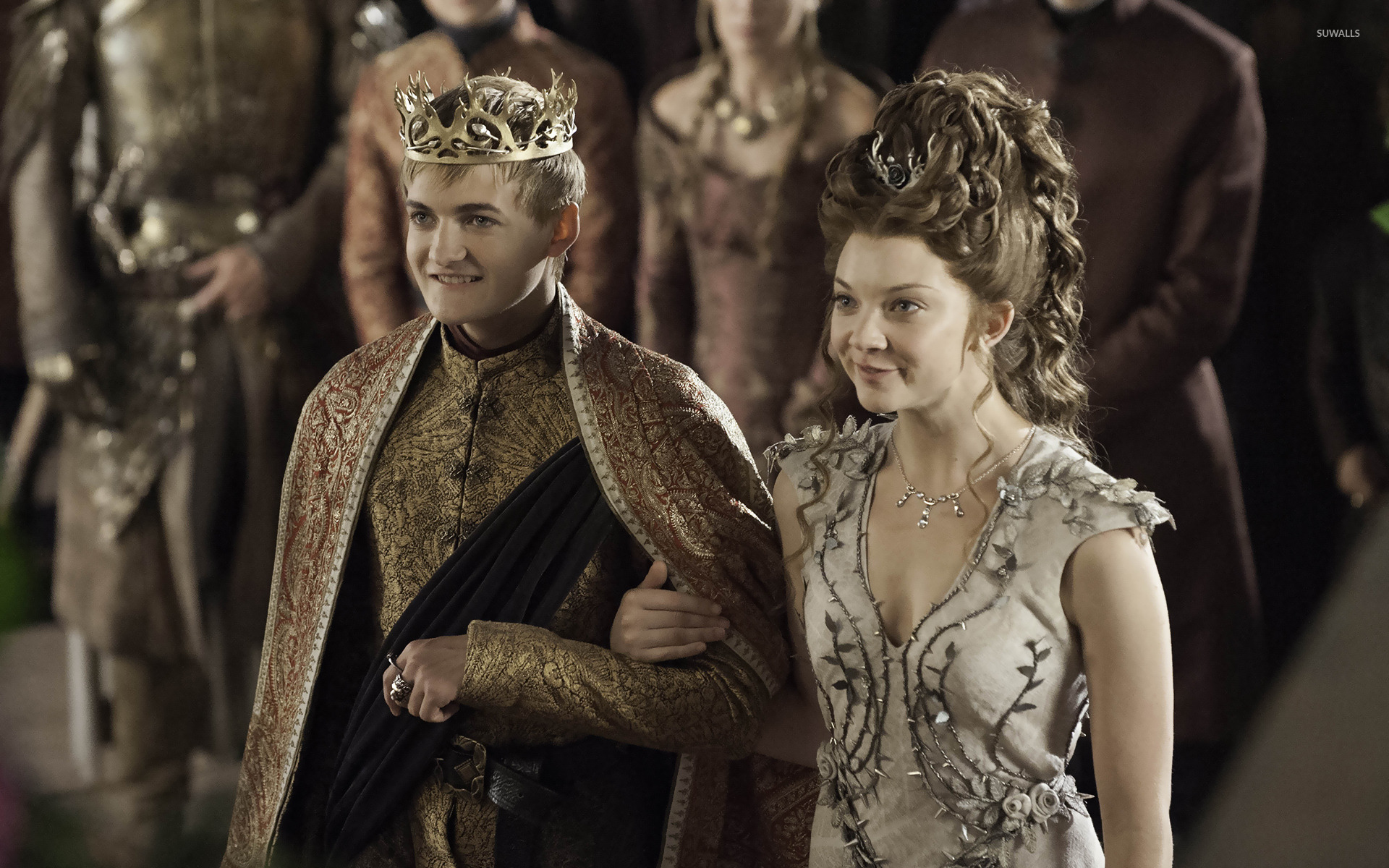 Description: A man and a woman in medieval costumes standing next to each other with a crown on their head and a group of people behind them.