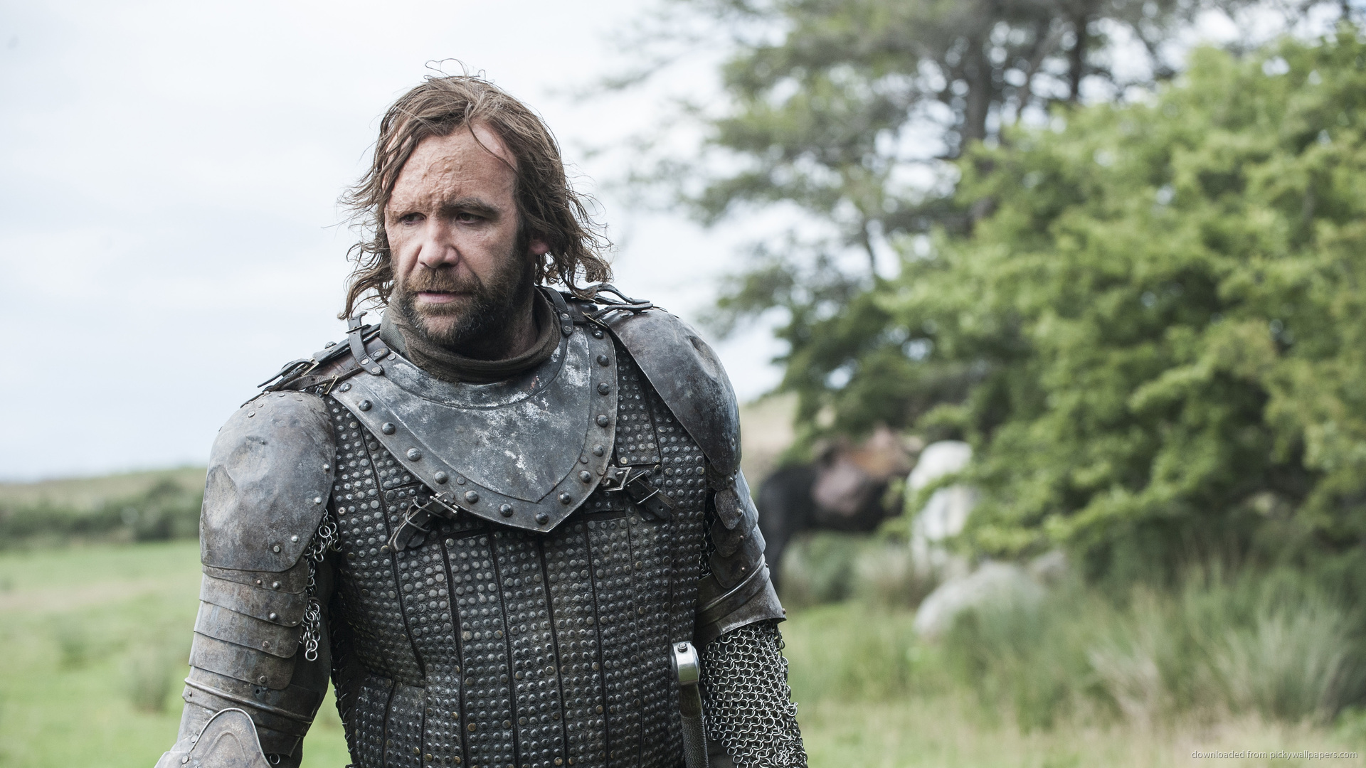 Description: A man in a medieval armor standing in a field with trees in the background and a sky background with clouds.