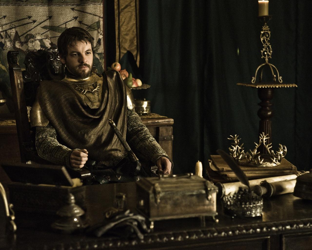 Description: A man in a medieval costume sitting in a chair in a room with a table and a painting on the wall.