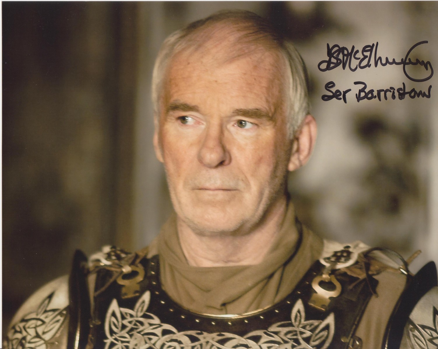Description: A man in a medieval outfit with a sword in his hand and a name on his chest and chest.