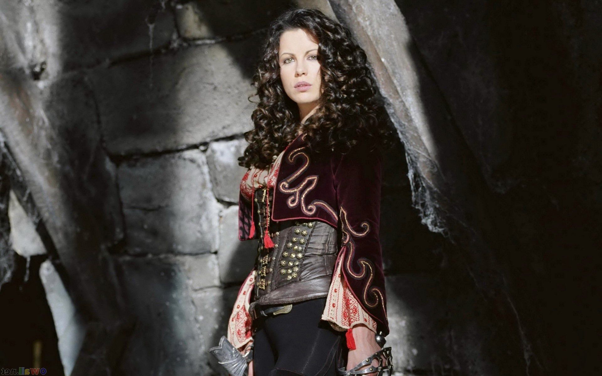 Description: A woman in a medieval costume standing in a cave with a sword in her hand and a helmet on her head.