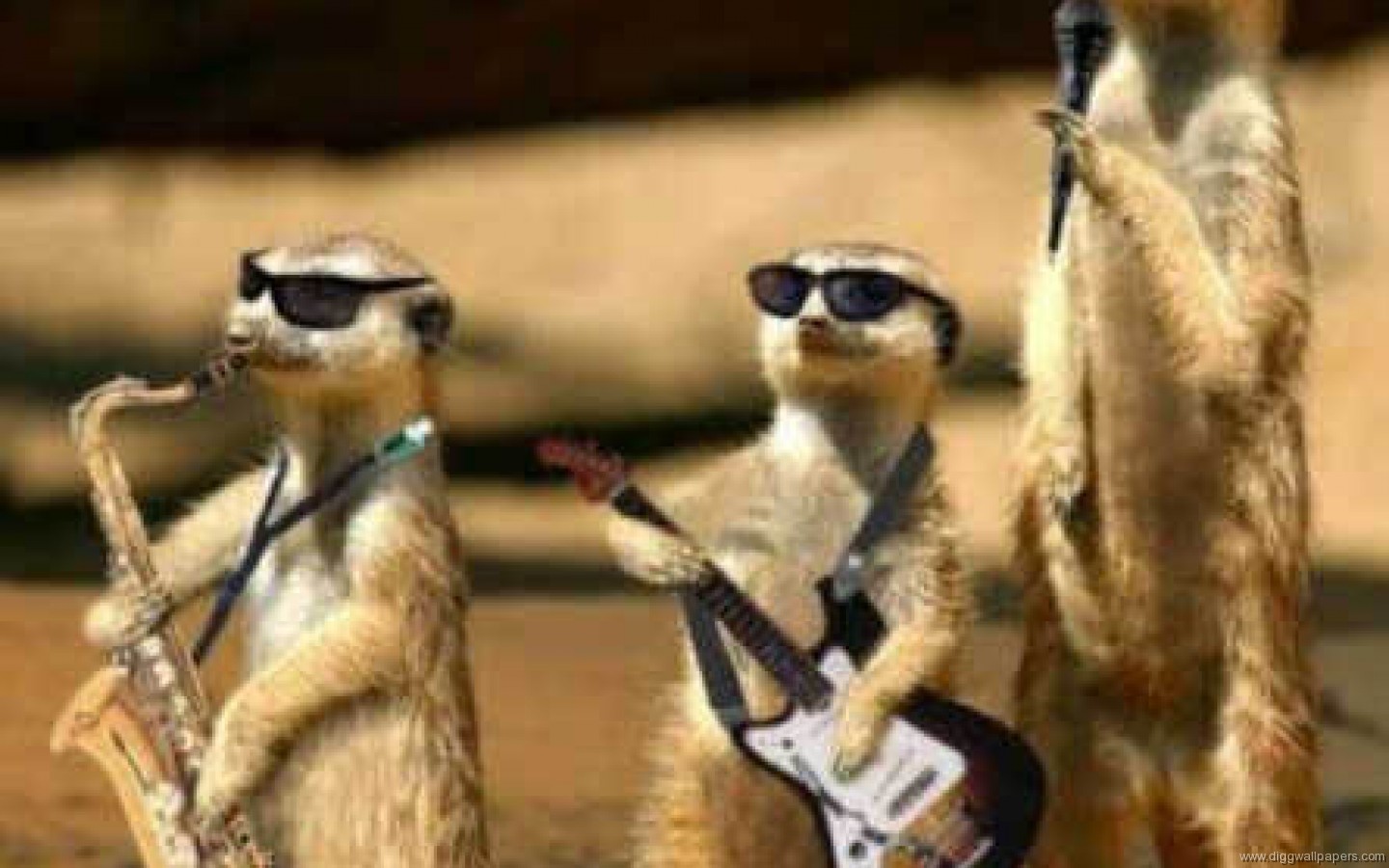 Description: Three meerkats playing music with their instruments and wearing sunglasses and holding a guitar in their hands.
