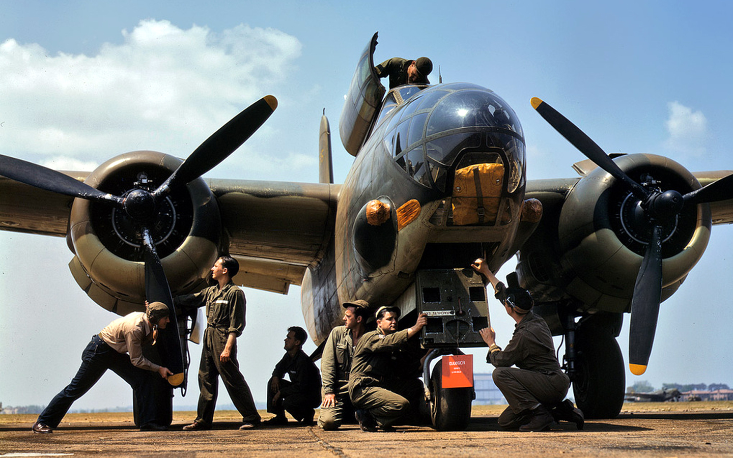 Description: A group of men standing around a large airplane on a runway with propellers on it's wings and a man in the foreground.