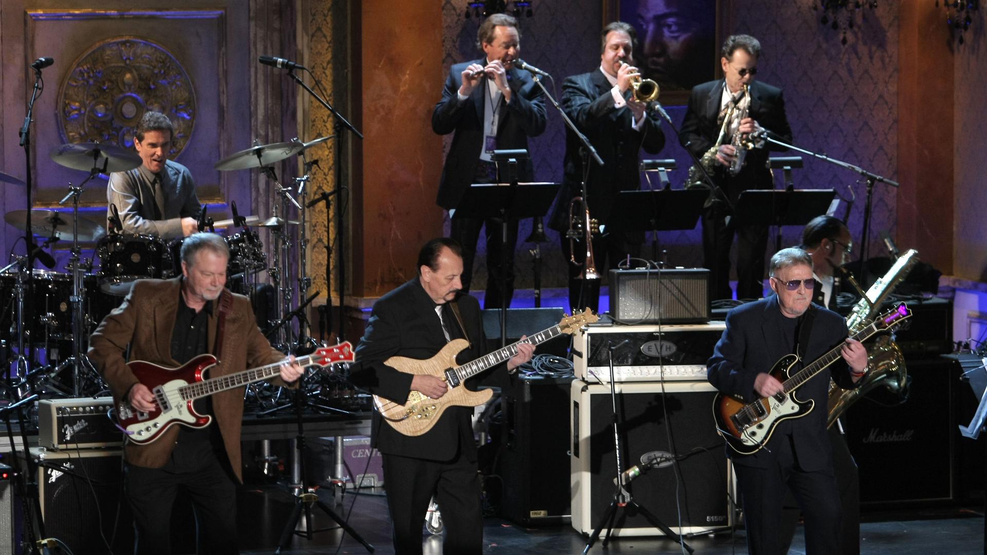 Description: A group of men playing instruments on stage with a band behind them and a microphone in the background with a microphone in the foreground.