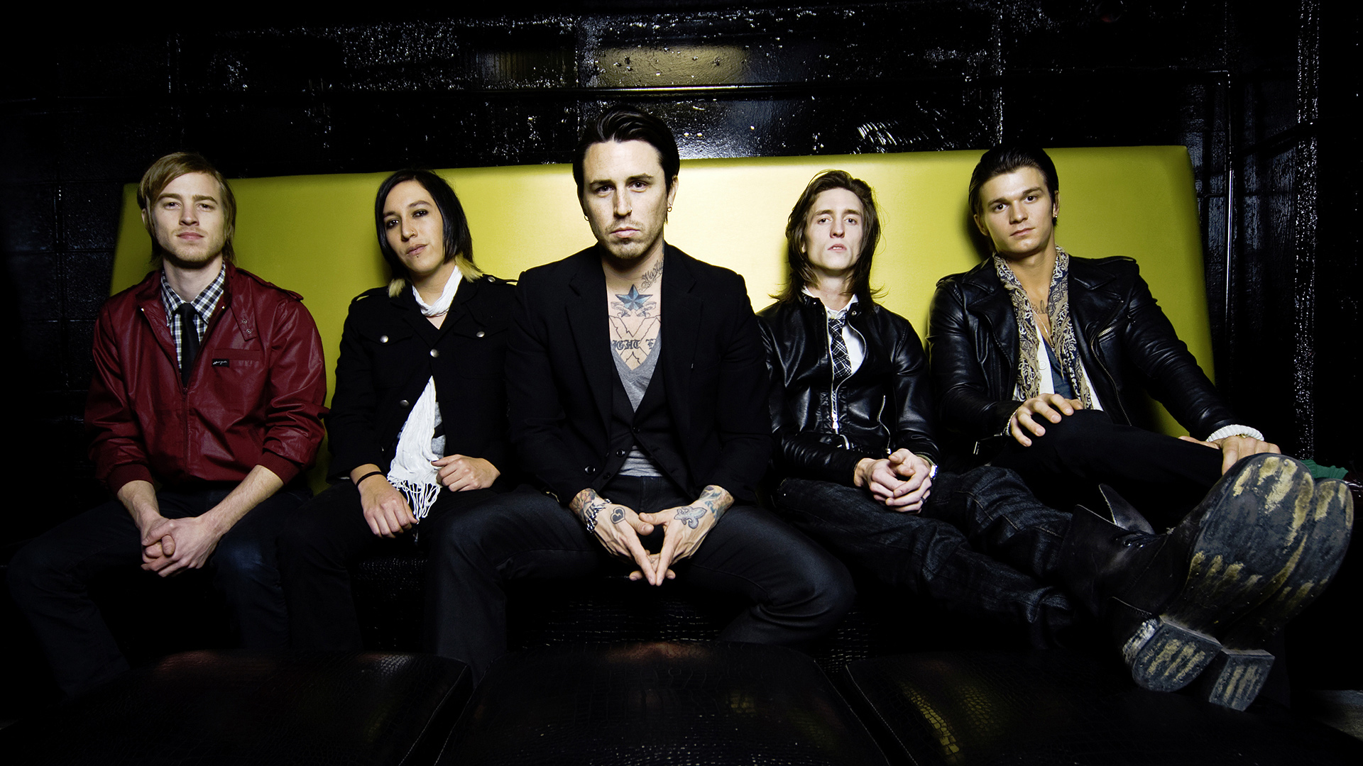 Description: A group of men sitting next to each other on a bench in a room with yellow walls and a yellow wall.