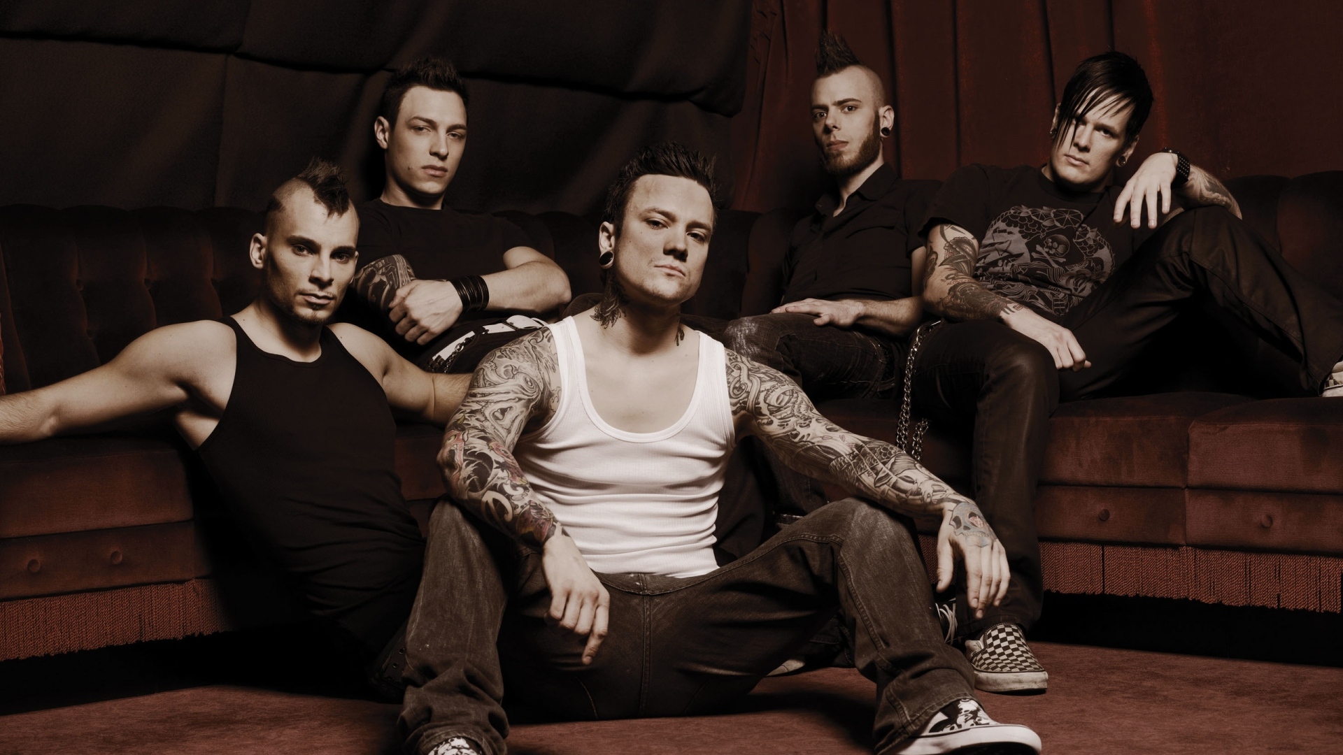 Description: A group of men sitting on top of a couch next to each other on a floor in front of a curtain.