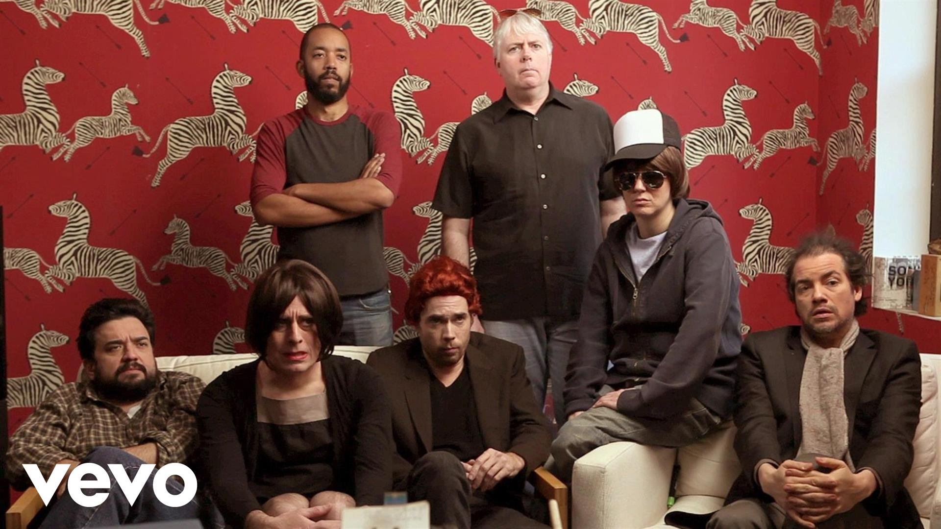 Description: A group of men sitting on top of a couch in front of a wall with zebras on it.