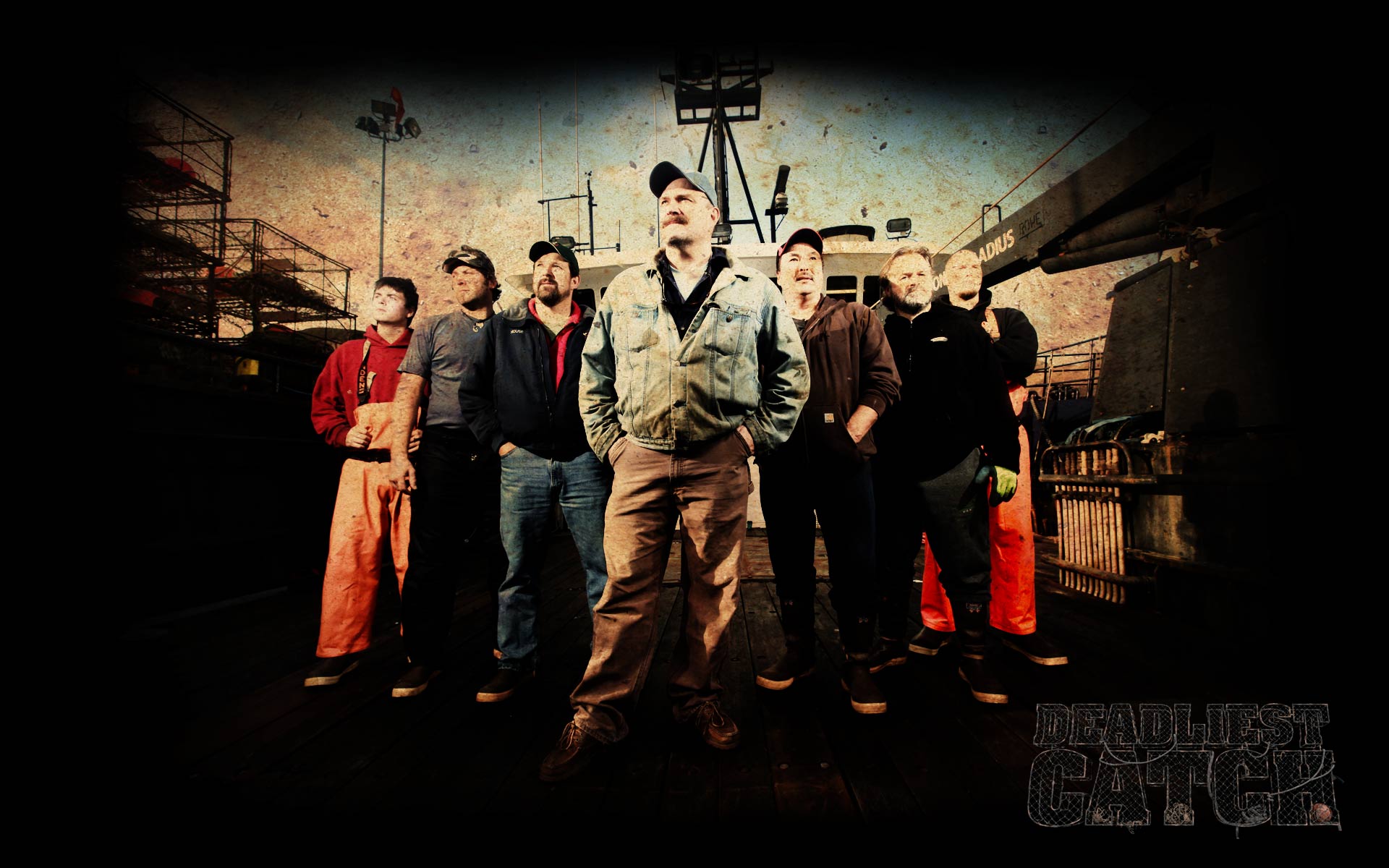 Description: A group of men standing next to each other on a dock with a boat in the background and a man in a tie.