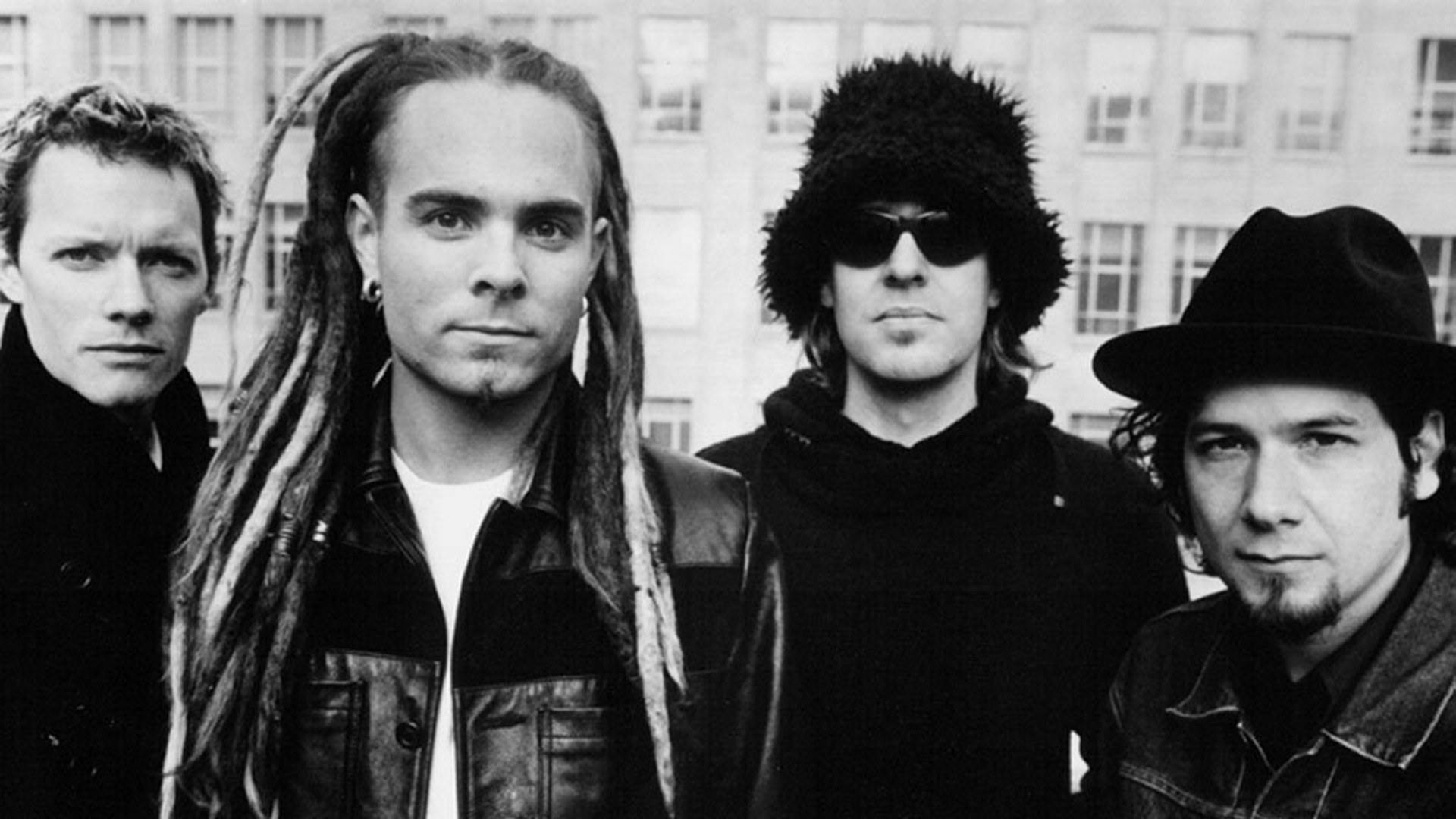 Description: A group of men with dreadlocks standing next to each other in front of a building with a tall building.