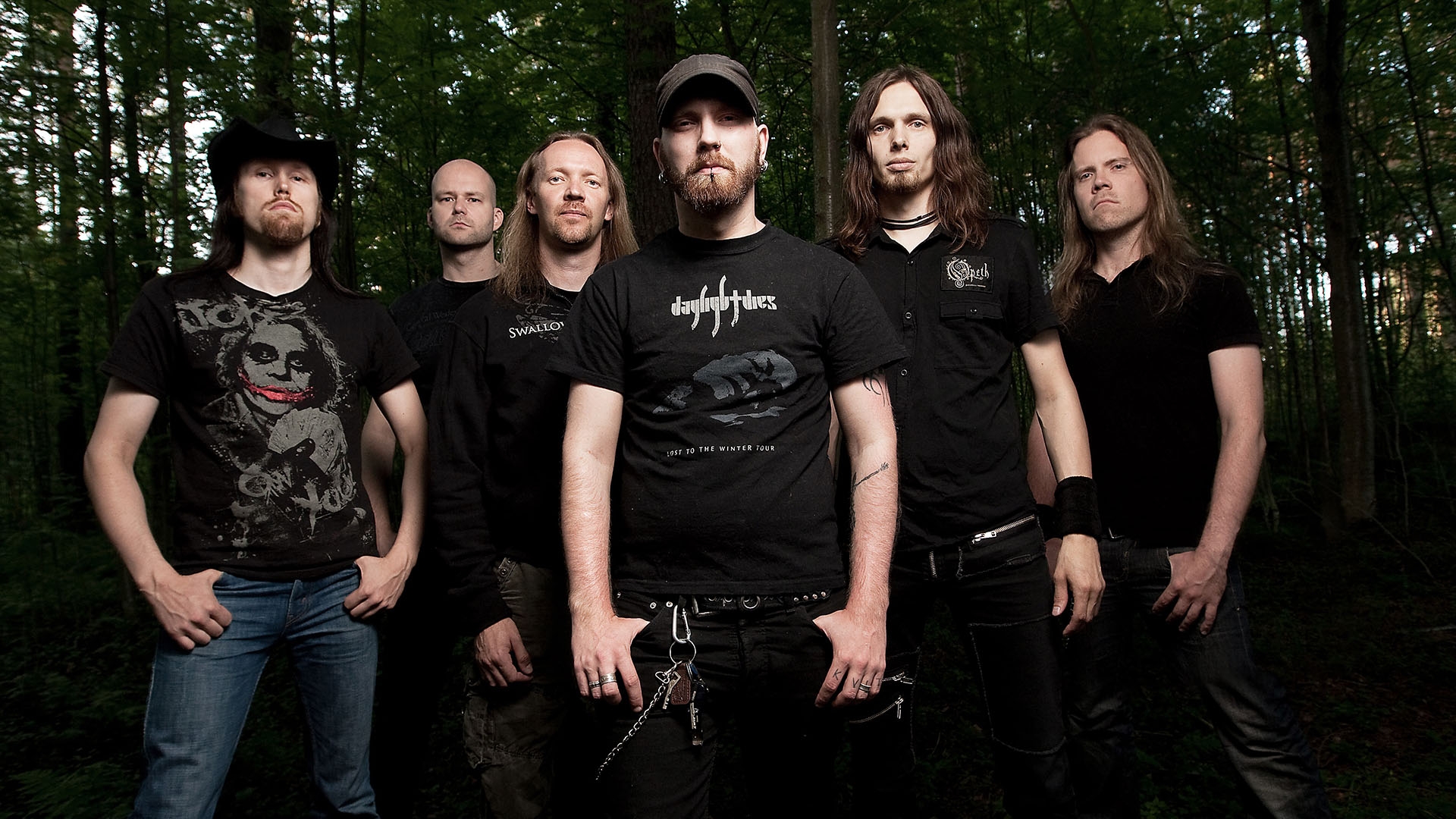 Description: A group of men standing in a forest with trees in the background and one man wearing a black shirt.