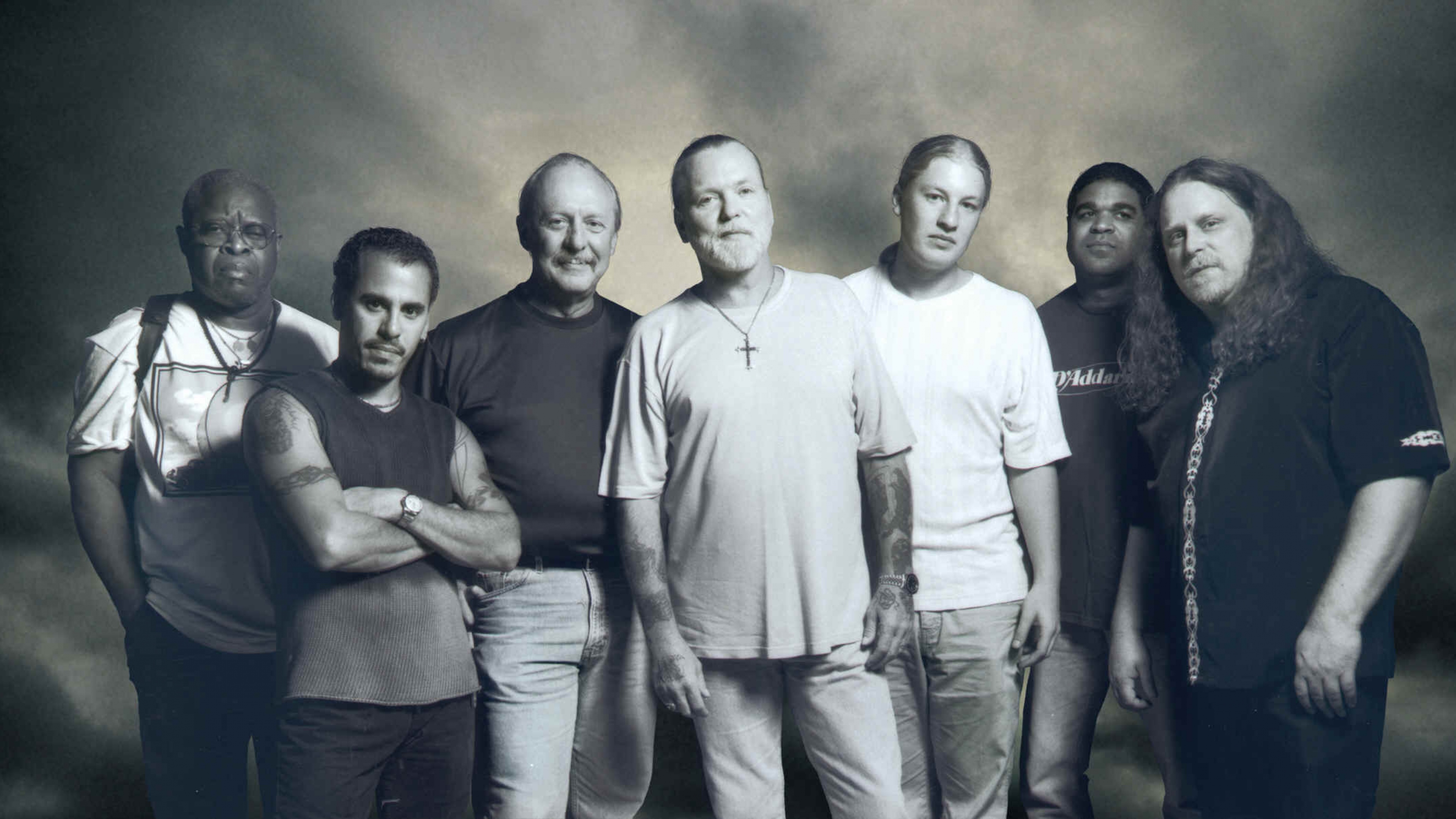 Description: A group of men standing next to each other in front of a cloudy sky with a cross on it.