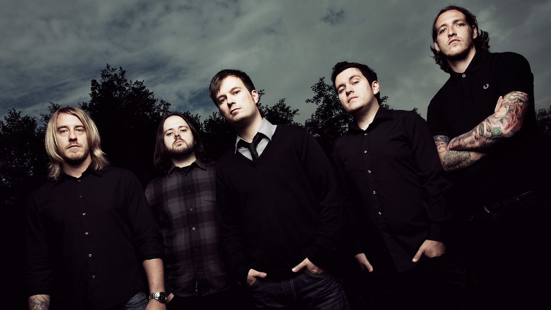 Description: A group of men standing next to each other under a cloudy sky with trees in the background and a dark sky behind them.