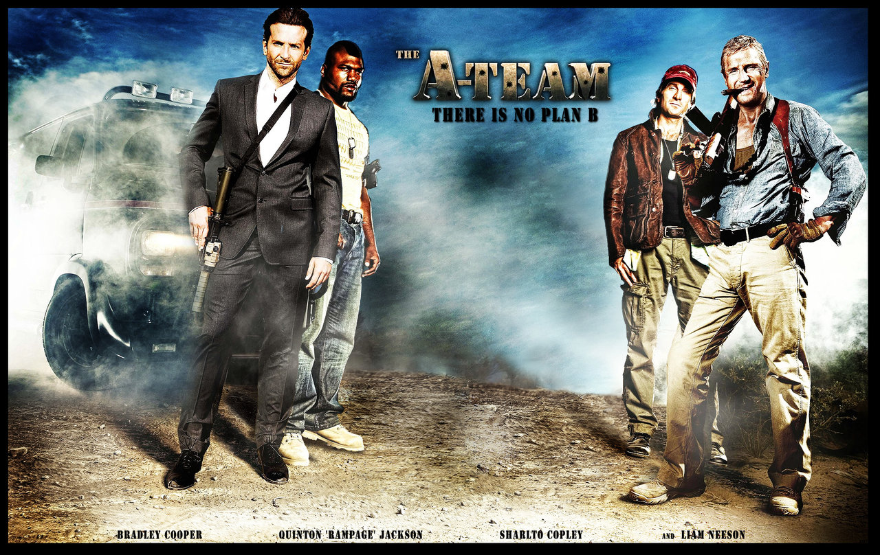 Description: A group of men standing next to each other in front of a car and a truck with the words the a team.