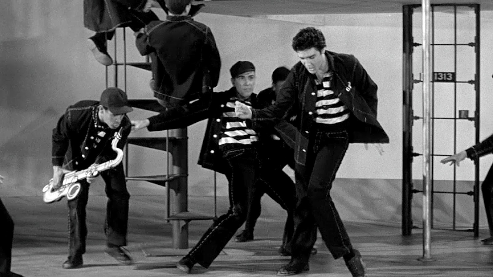 Description: A group of men standing around each other in a room with a guitar and a man in a suit.