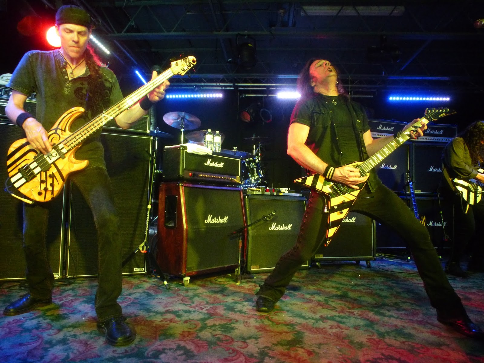 Description: A group of men playing guitars on stage at a concert with other musicians in the background and a speaker on the floor.