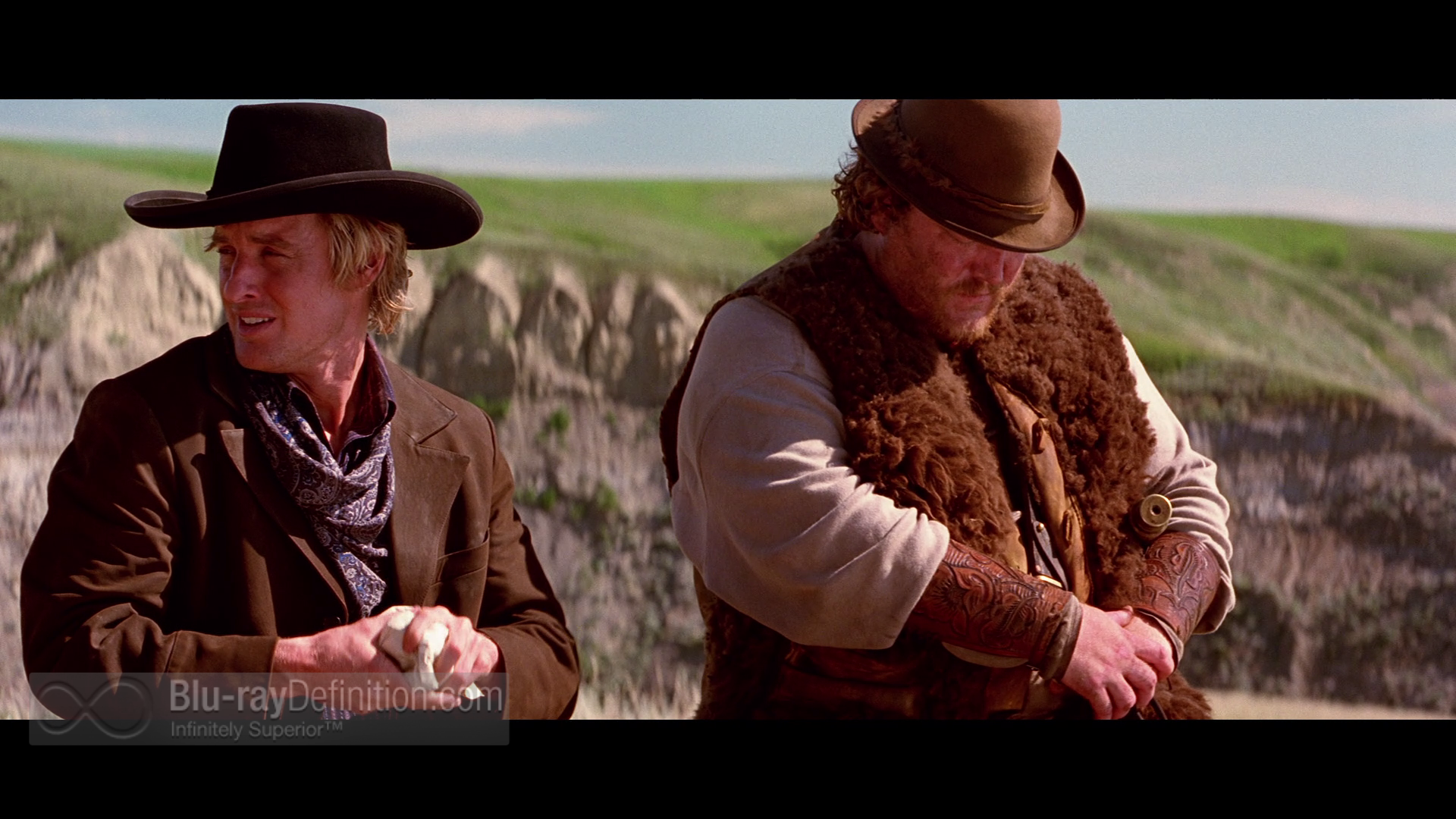 Description: Two men in hats and scarves are standing near a mountain side area with a green hill in the background.