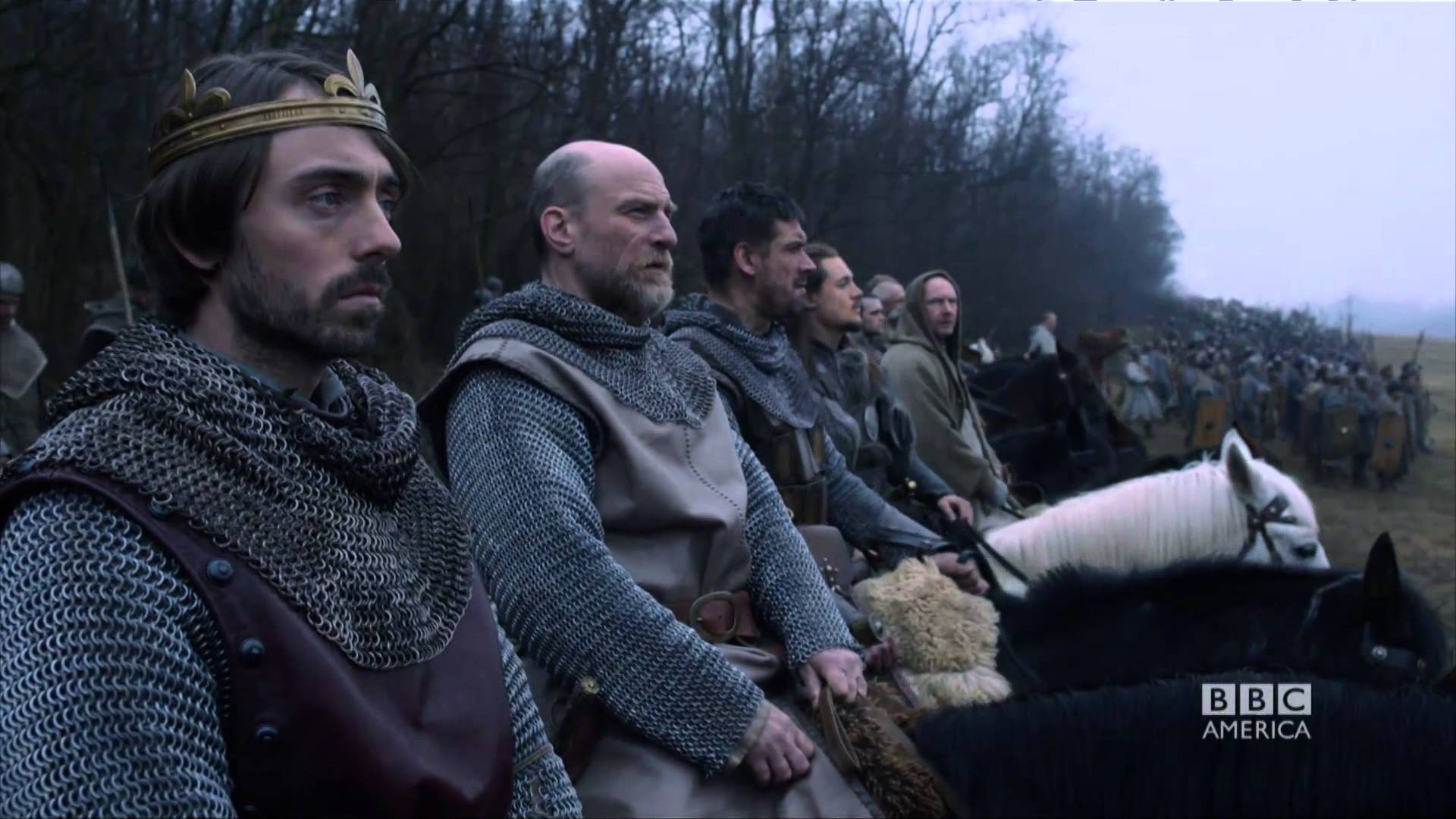 Description: A group of men riding horses in a field with trees in the background and a sky background with clouds.