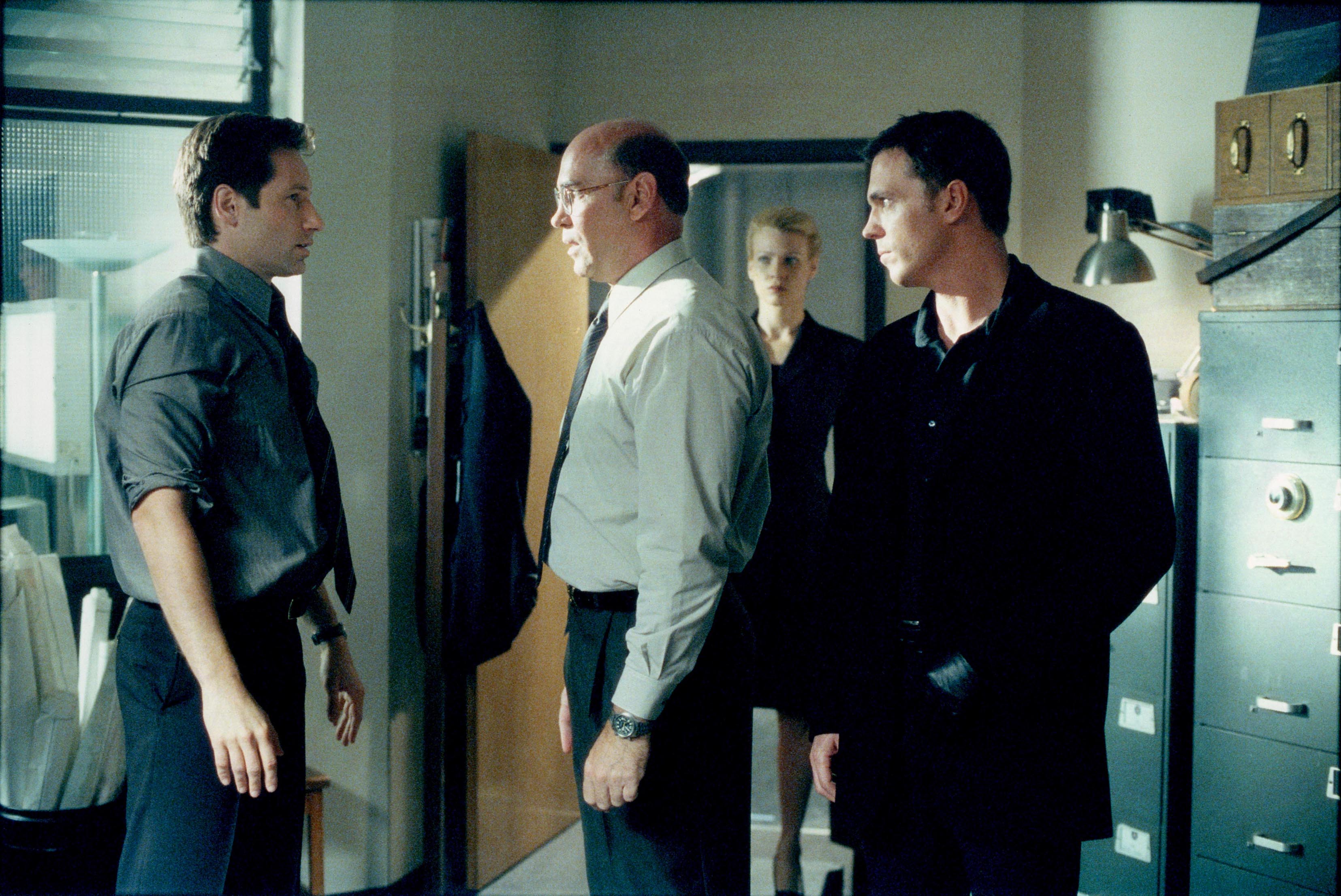 Description: A group of men standing around a locker in a room with a mirror on the wall and a door open.