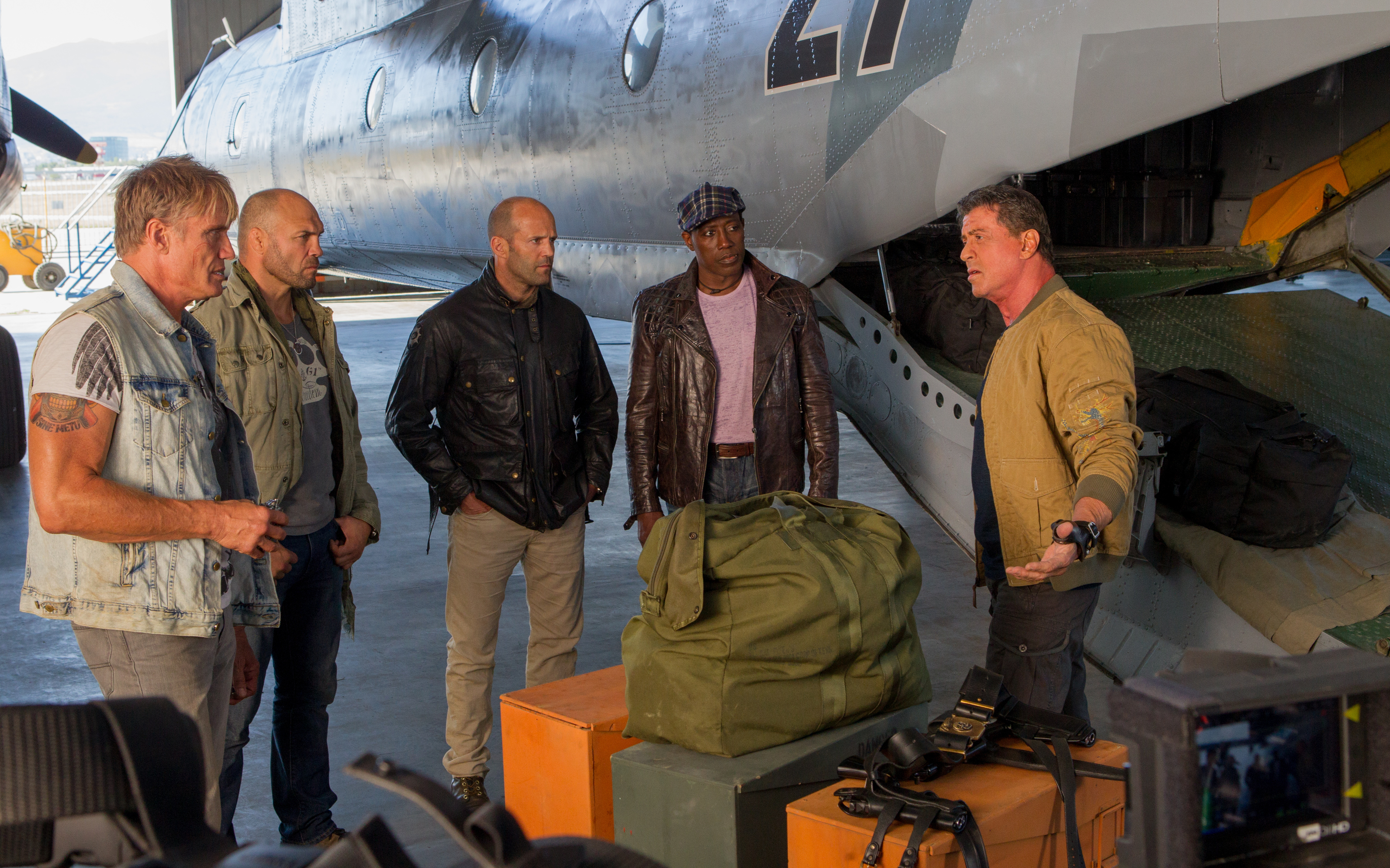 Description: A group of men standing around a plane with luggage on the ground and a man in a leather jacket.