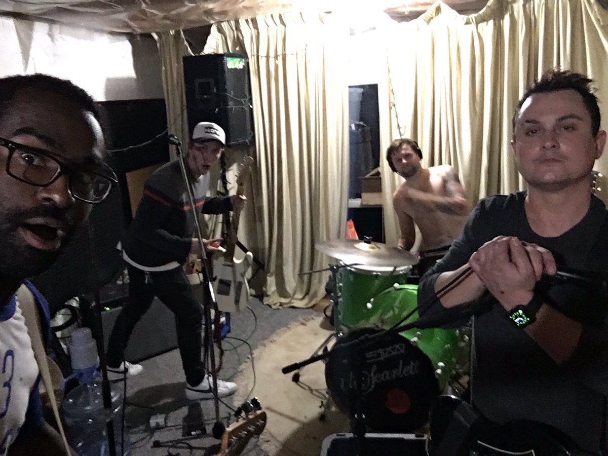 Description: A group of men playing instruments in a room with curtains and curtains on the walls and a man in the foreground.