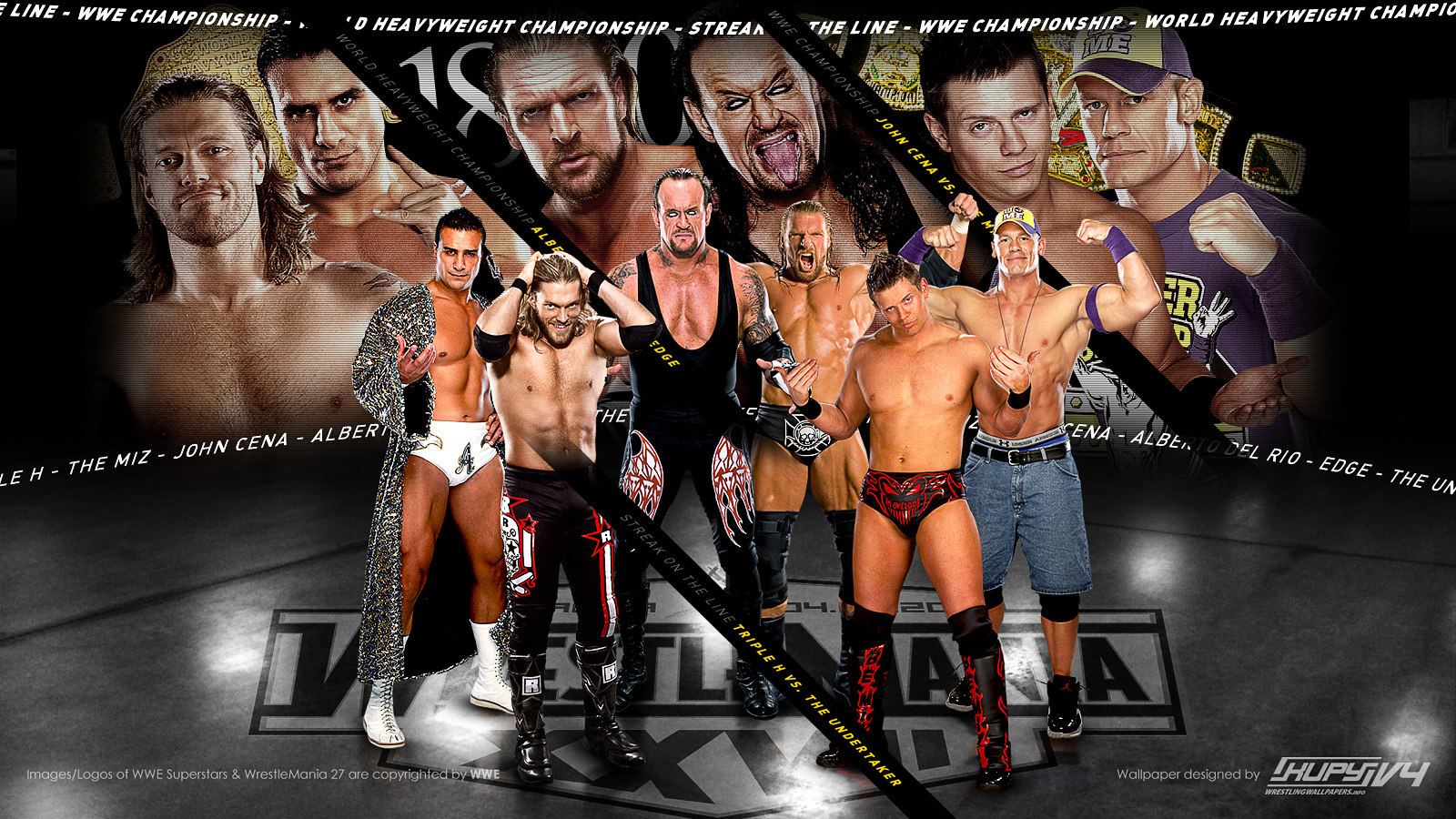 Description: A group of men standing next to each other in front of a poster of wrestlers and their names on a wall.