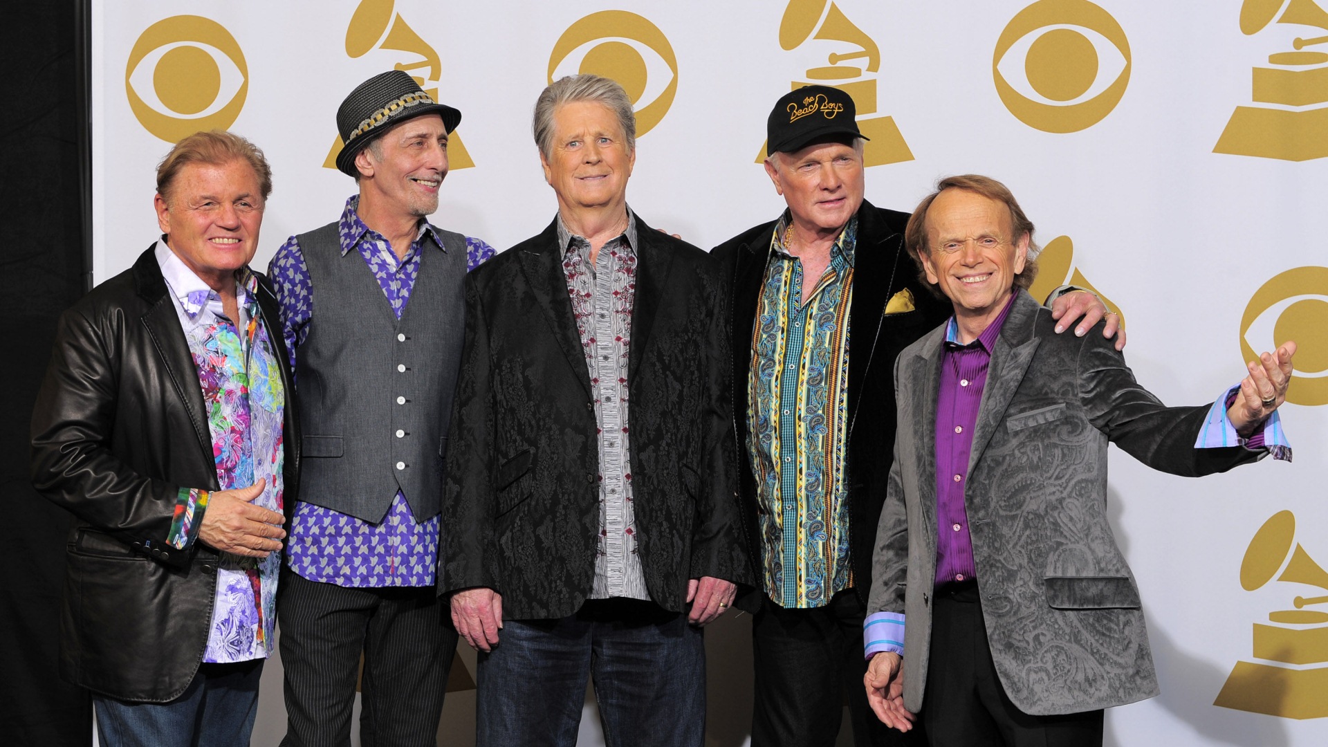 Description: A group of men standing next to each other on a red carpet in front of a wall with a gold and silver clock.